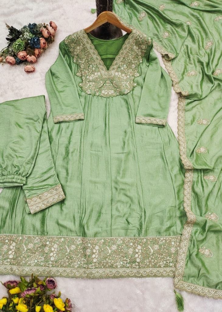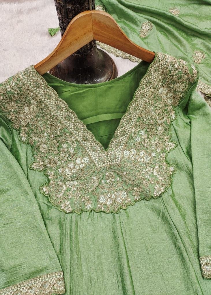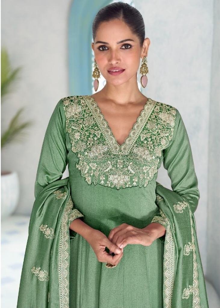 | NAME : | Aashirwad Creation Mor Bagh By Vihanika Anarkali Gown Heavy Premium Silk With Heavy Embroidery Sequence Codding Work Pista Color DN 10446 |