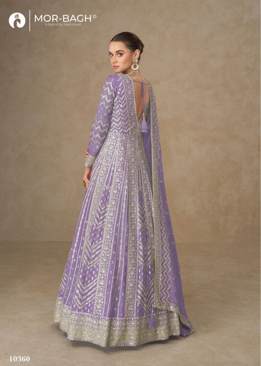 | NAME : | Aashirwad Mor Bagh Anarkali DN 10360 Premium Chinnon Silk With Heavy Embroidery Work Anarkali Gown Purple Color |