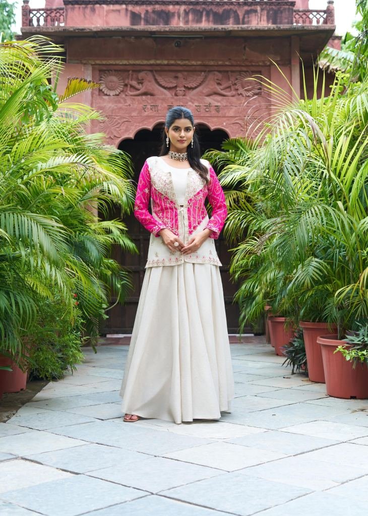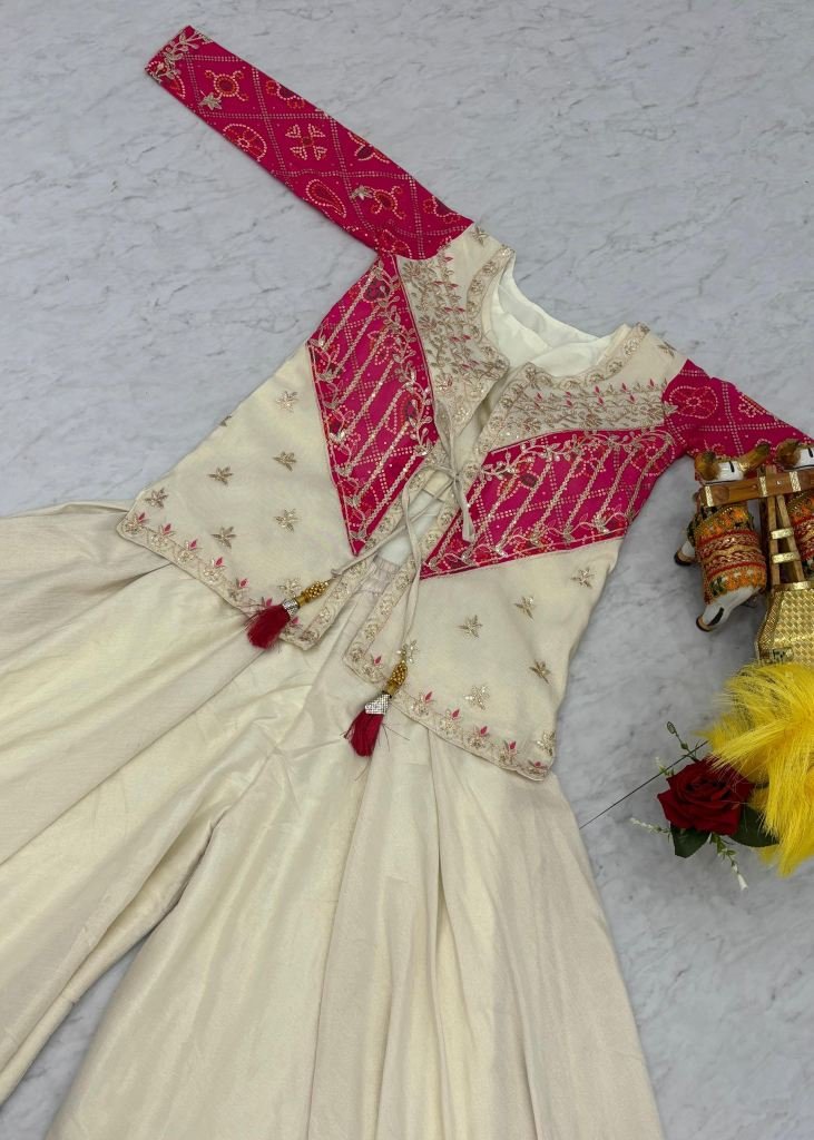 Bandhej Koti Palazzo With Choli Set Crafted In Pure Cosmos Silk White And Pink Color DN 111