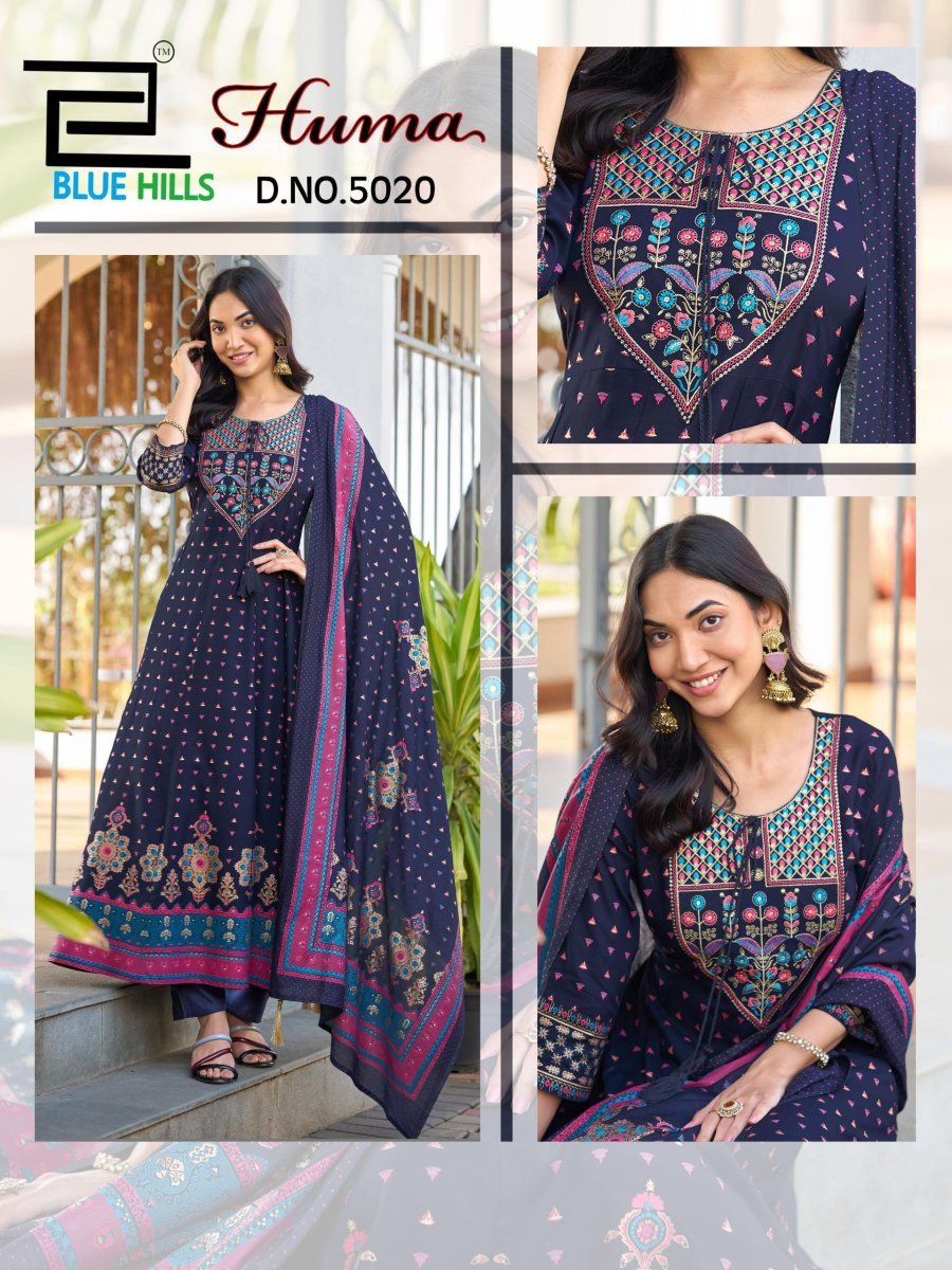 | NAME : | Blue Hills Huma Rayon Anarkali Gown Dupatta Set With Embroidery Work Kurti Pant And Dupatta |