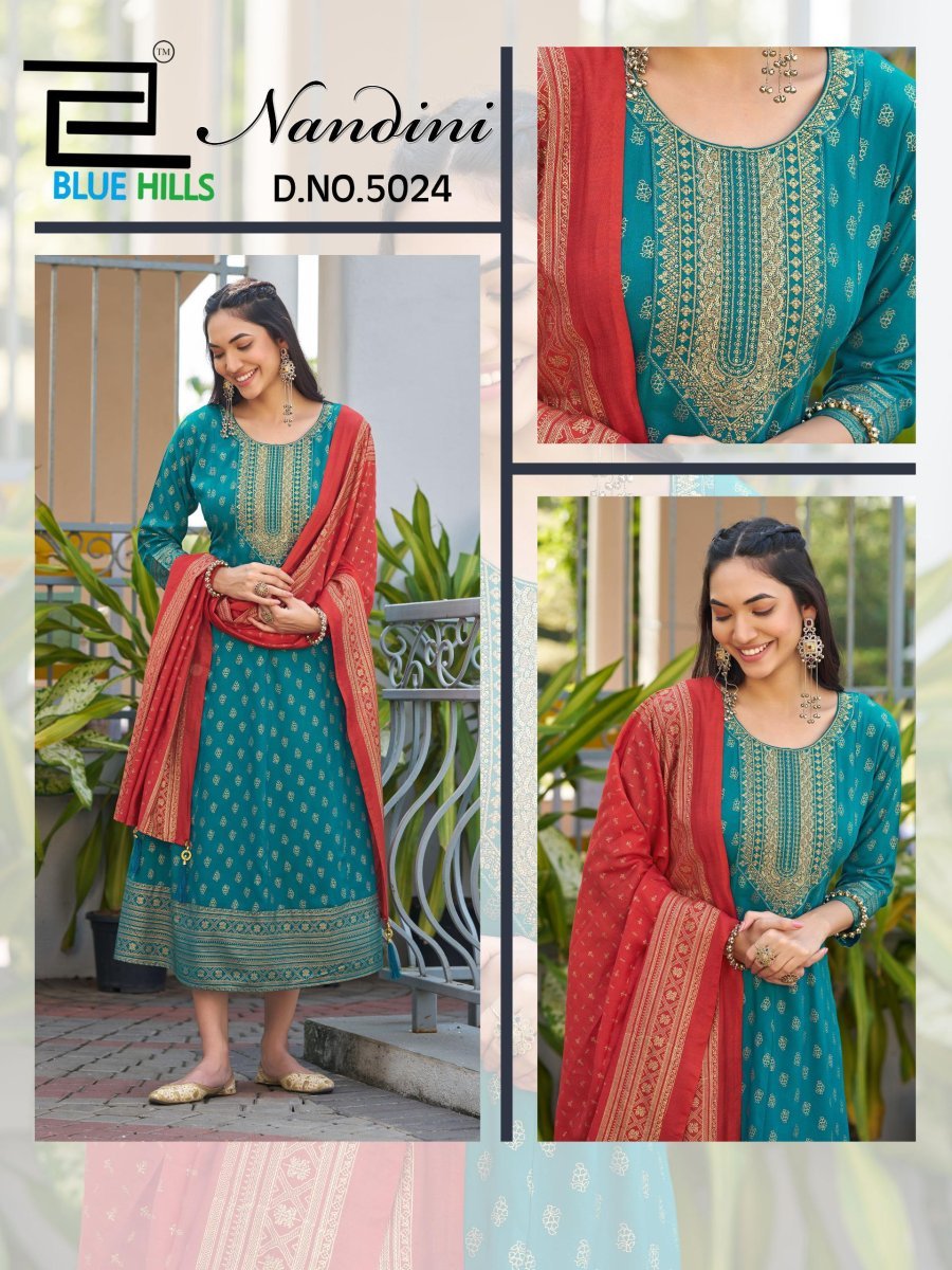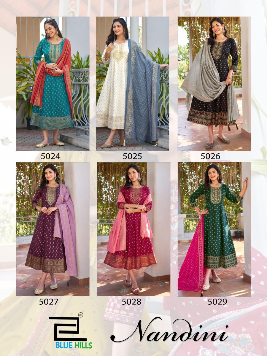 | NAME : | Blue Hills Nandini Rayon Foil Print Anarkali Gown With Dupatta Set |
