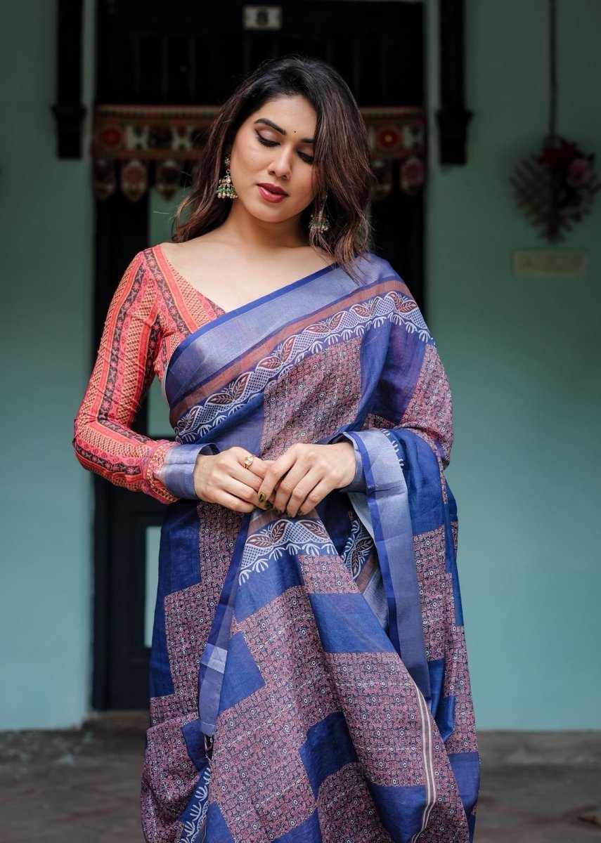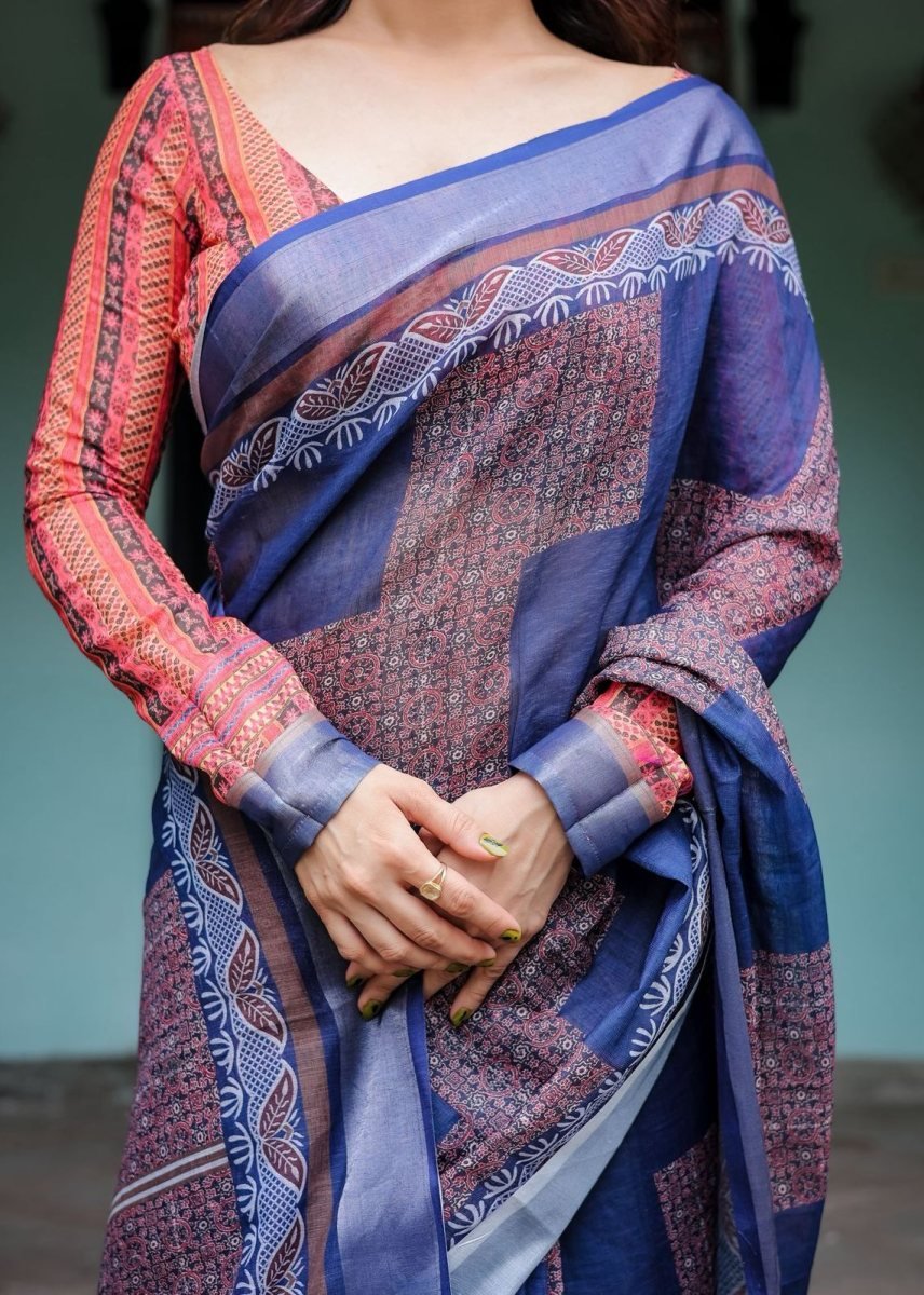 | NAME : | DN 122 Pure Linen Saree With Tassels In Deep Indigo Blue With Red Ethnic Prints |
