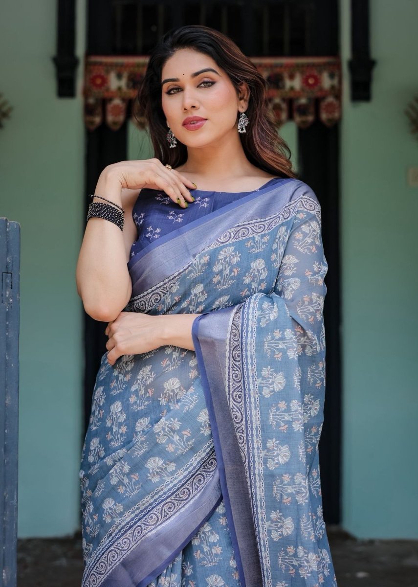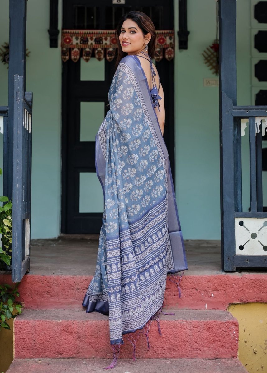 | NAME : | DN 124 Pure Linen Saree With Tassels And Elegant Designer Print Dusty Blue Color |