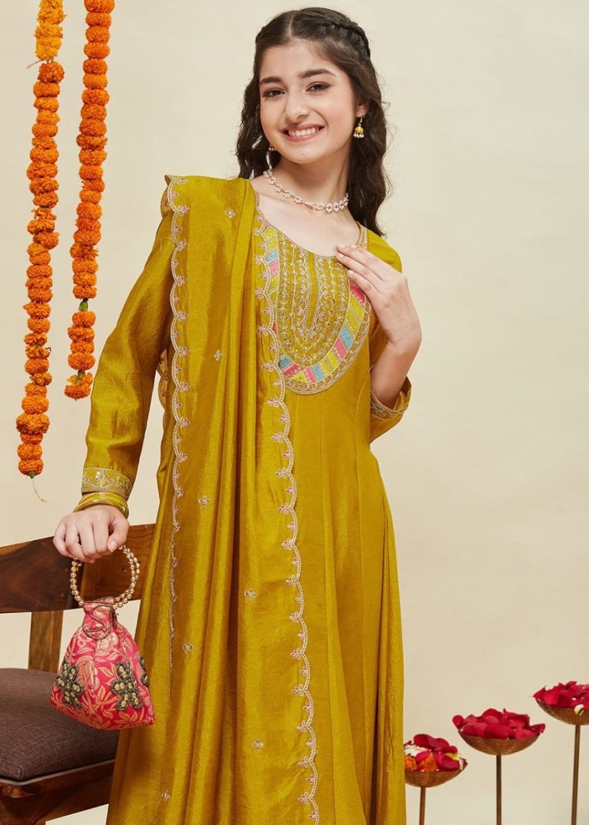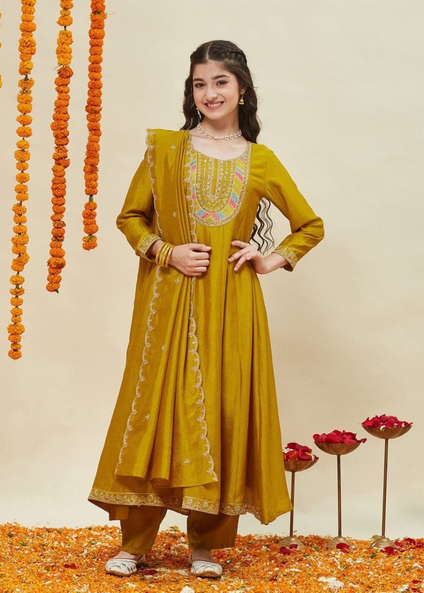 | NAME : | DN 171 Girls Vichitra Silk Anarkali Kurti Pant Dupatta Set With Embroidered Neck Design In Mustard Yellow Color |
