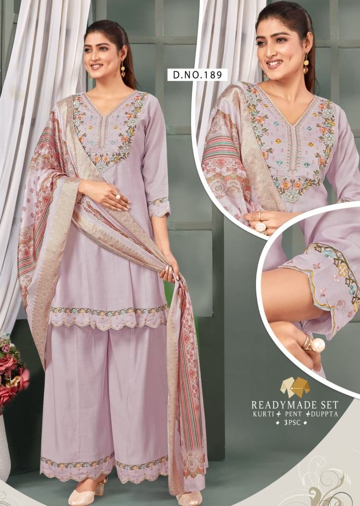Demanding Festival Roman silk With Cotton Inner And Embroidery Work With Hand work 3 pices Kurti Set Light Purple Color DN 189