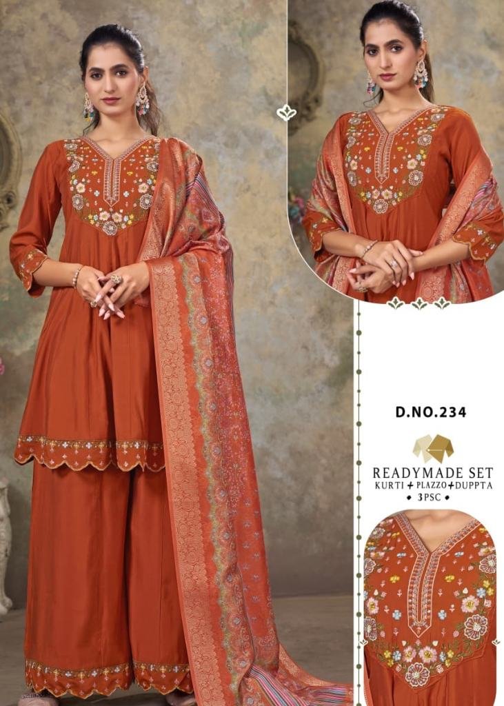 | NAME : | Demanding Festival Roman Silk With Cotton Inner And Embroidery Work With Hand Work 3 Pieces Kurti Set Orange Color DN 234 |