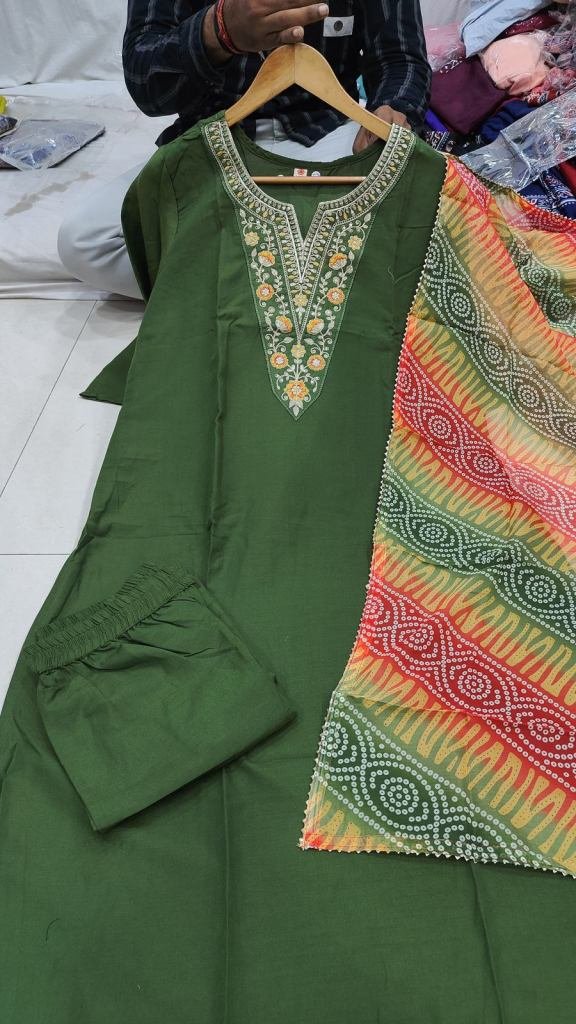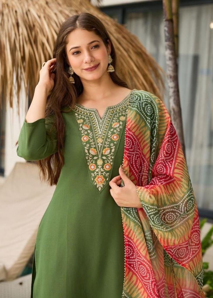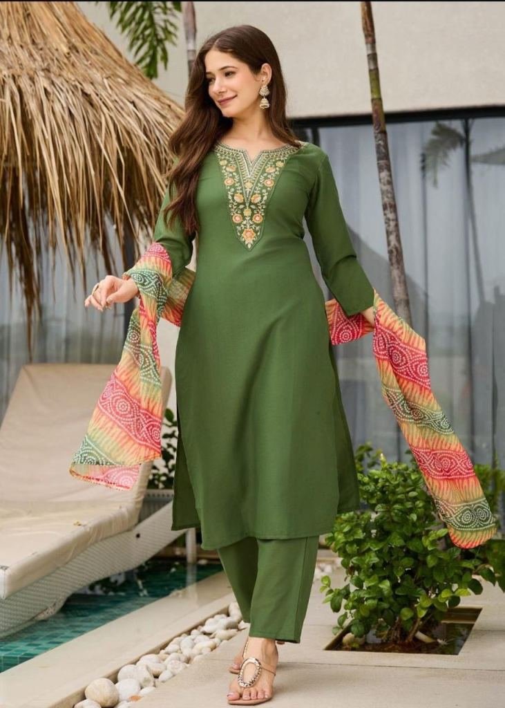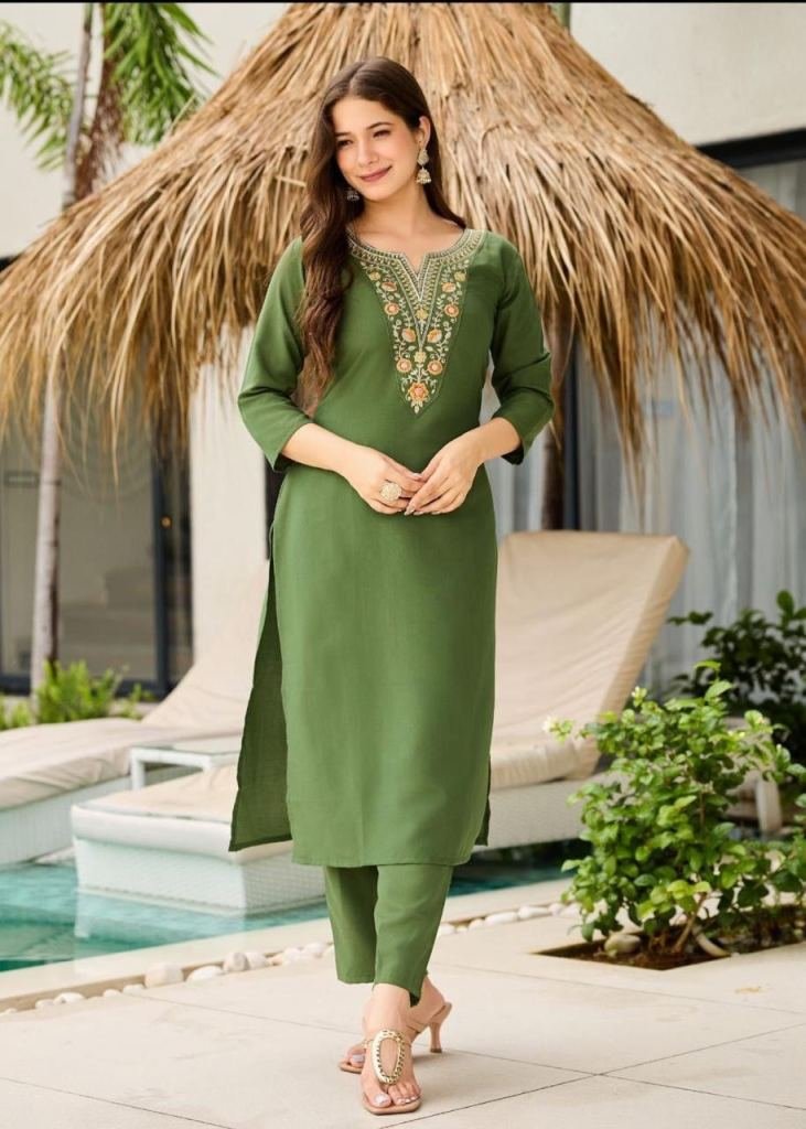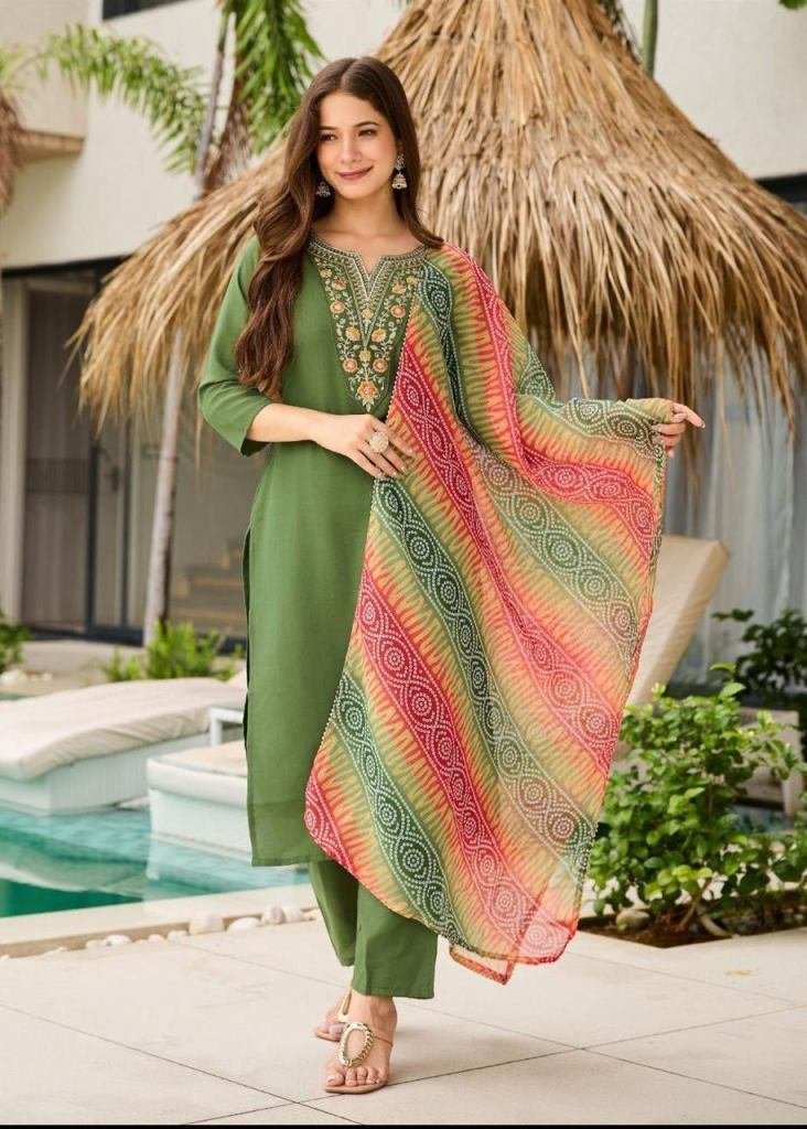 NAME : | Designer 3-Piece Kurti Set Rayon With Embroidery And Sequence Work Elegant Ethnic Wear for All Occasions Mehndi Color |