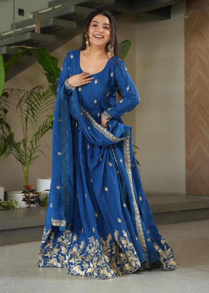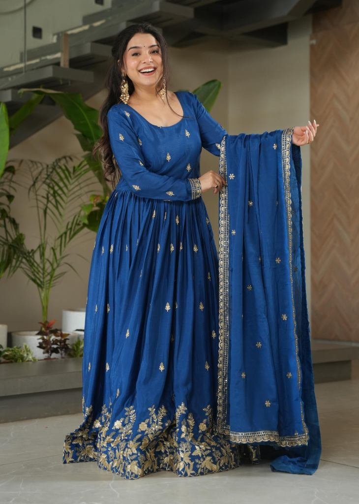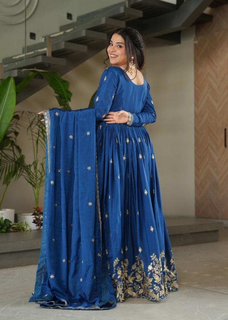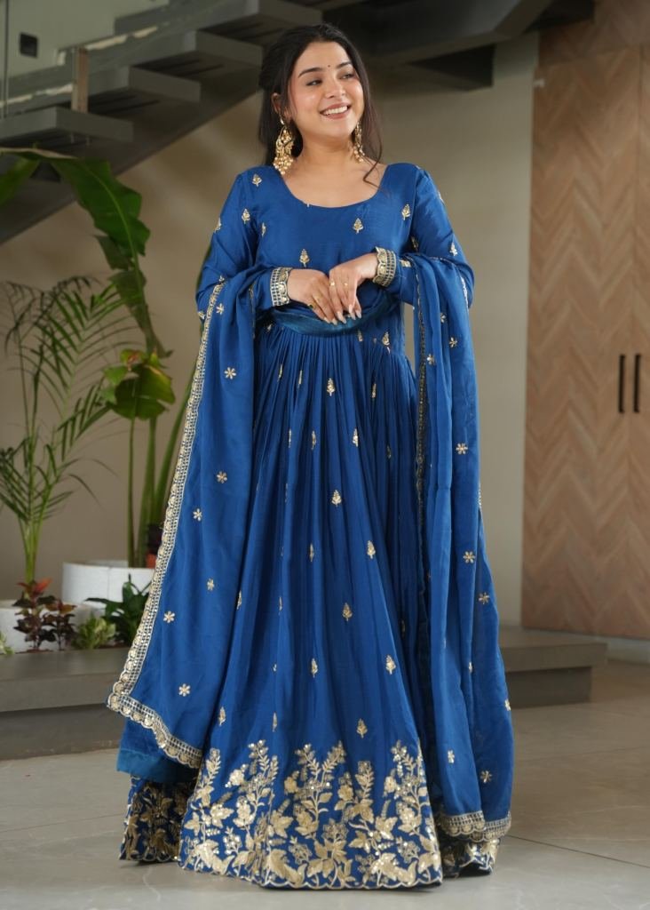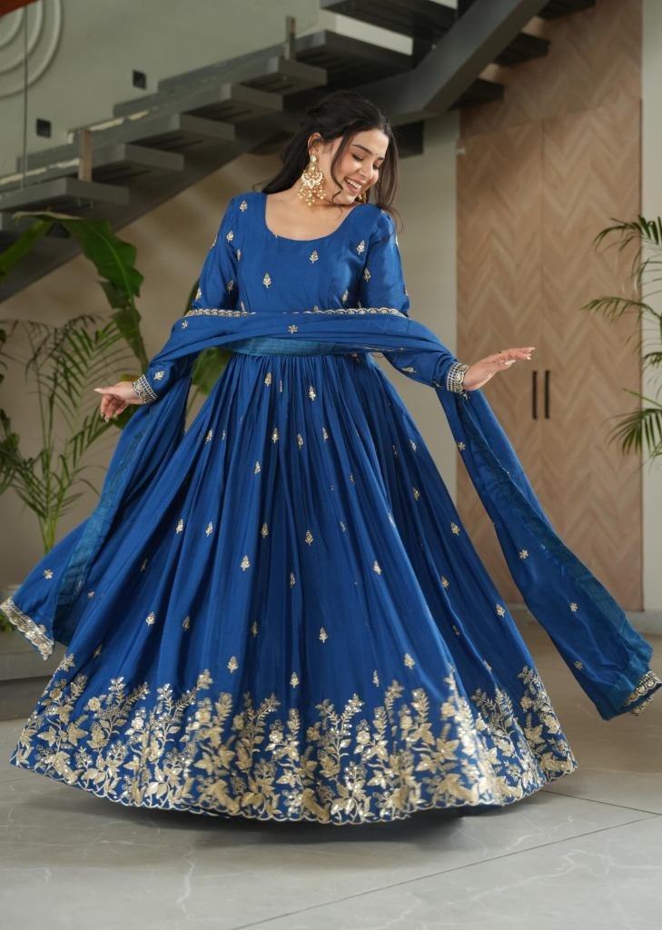 | NAME : | Designer Anarkali Gown Chinnon With Embroidery Sequence Work Blue Color KA DN 1166 |