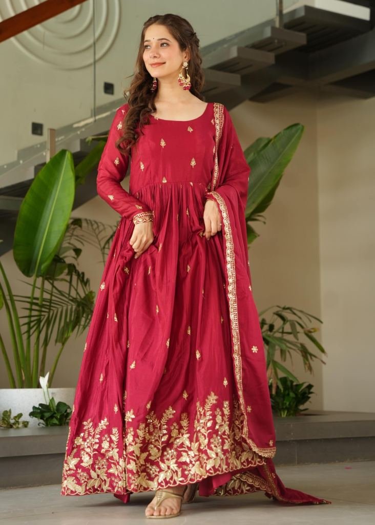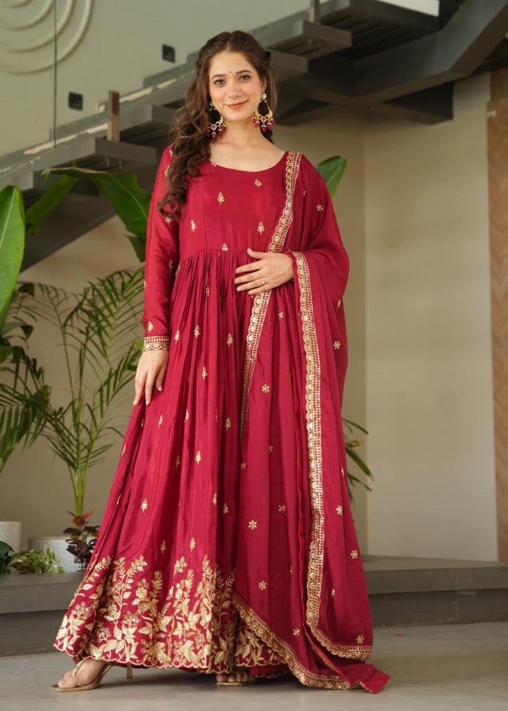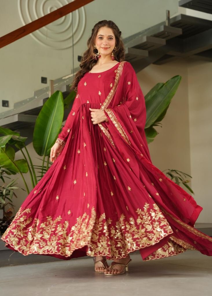 | NAME : | Designer Anarkali Gown Chinnon With Embroidery Sequence Work Maroon Color KA DN 1166 |