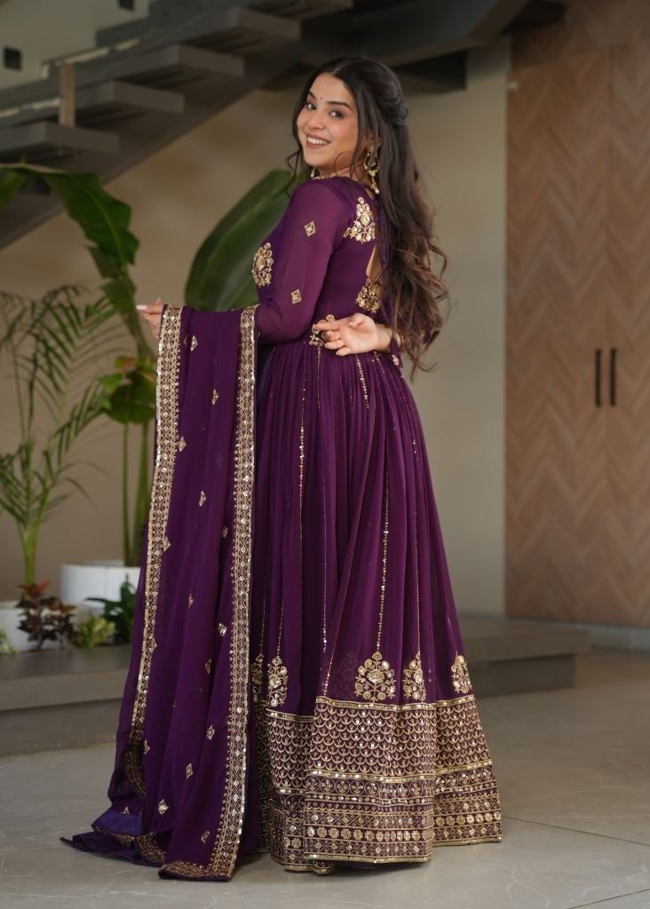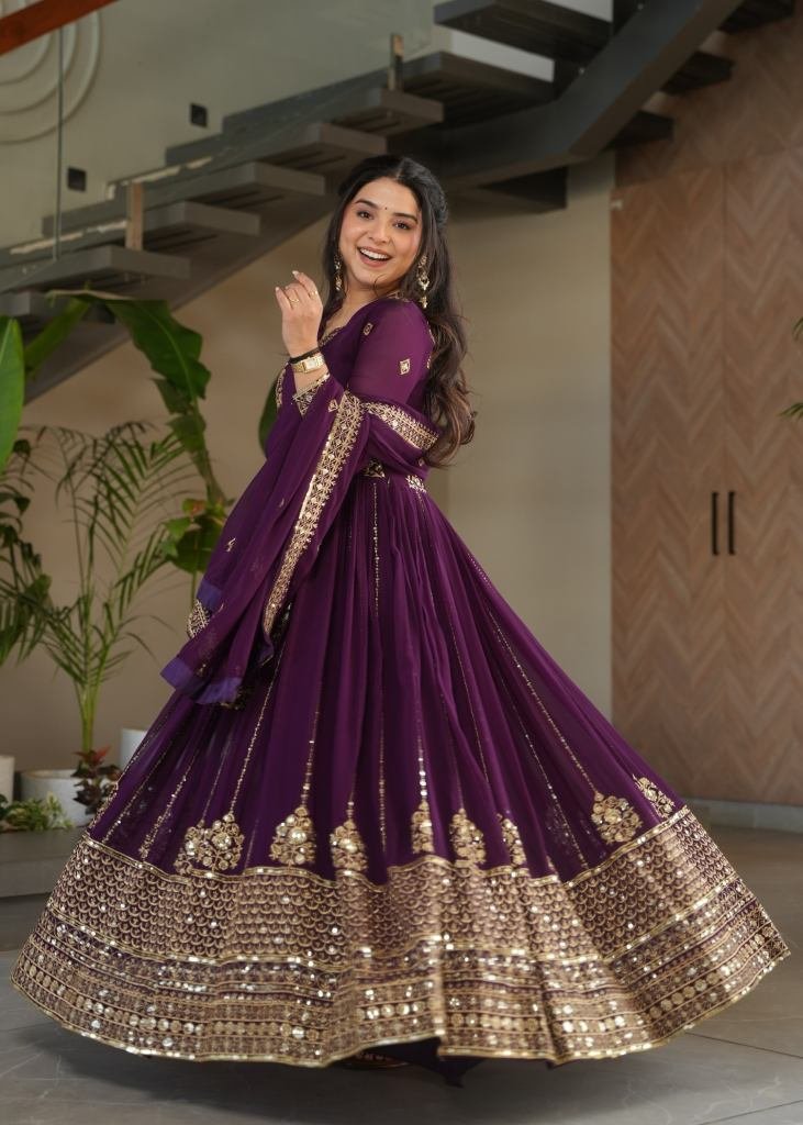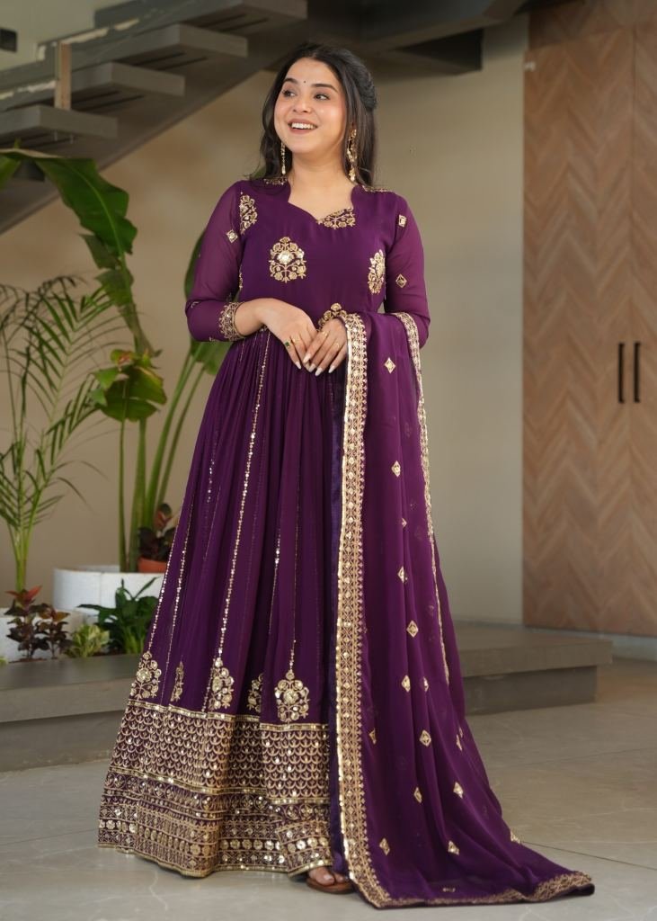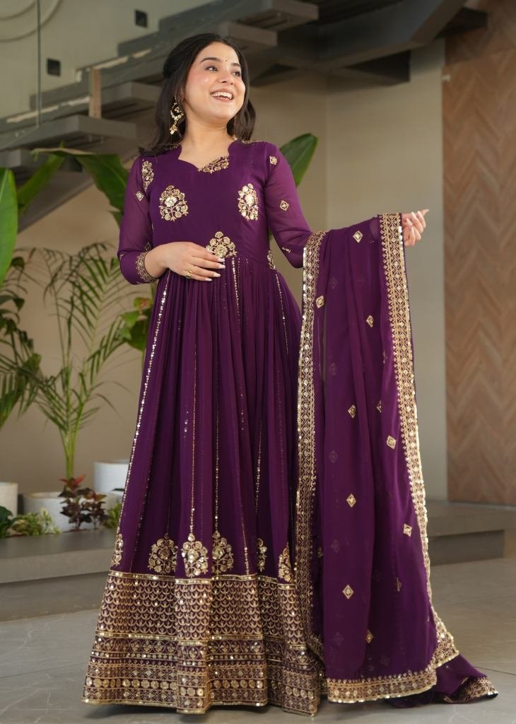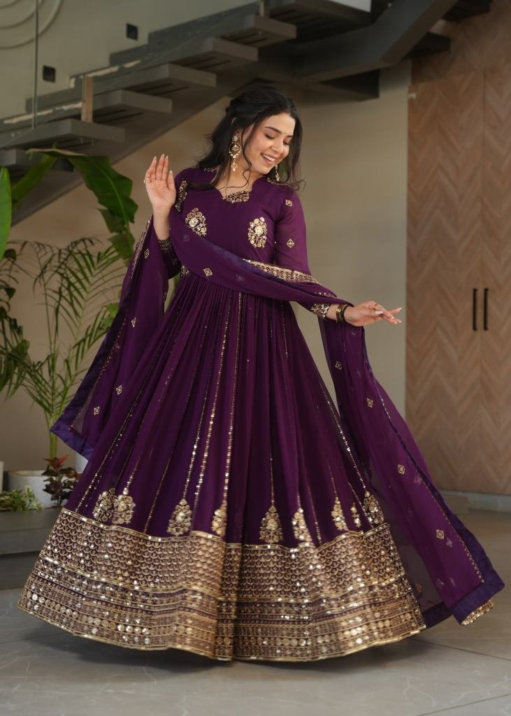 | NAME : | Designer Anarkali Gown Faux Blooming with Rich Zari And With Embroidery Sequence Work Purple Color LW DN 9262 |