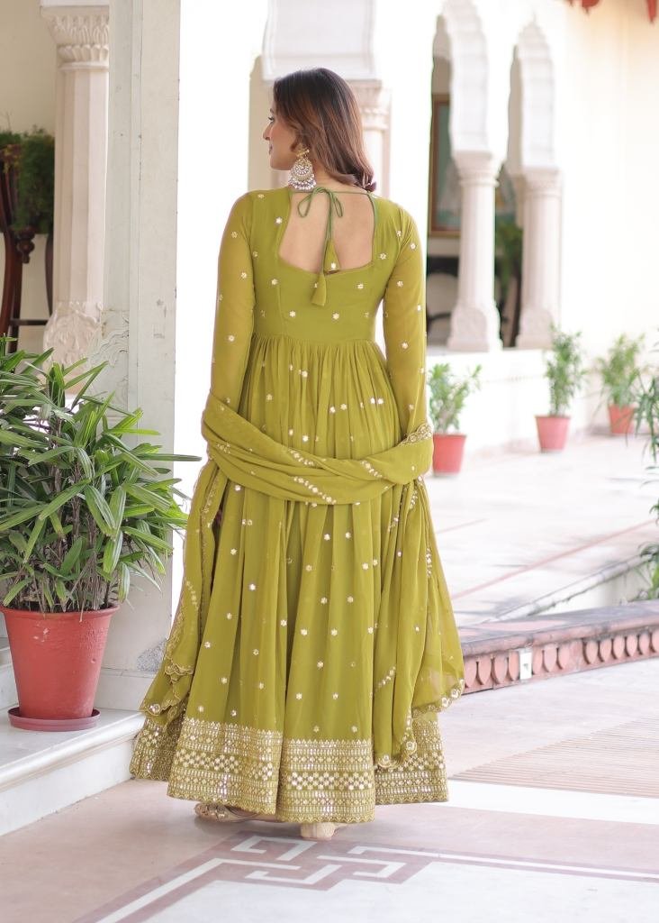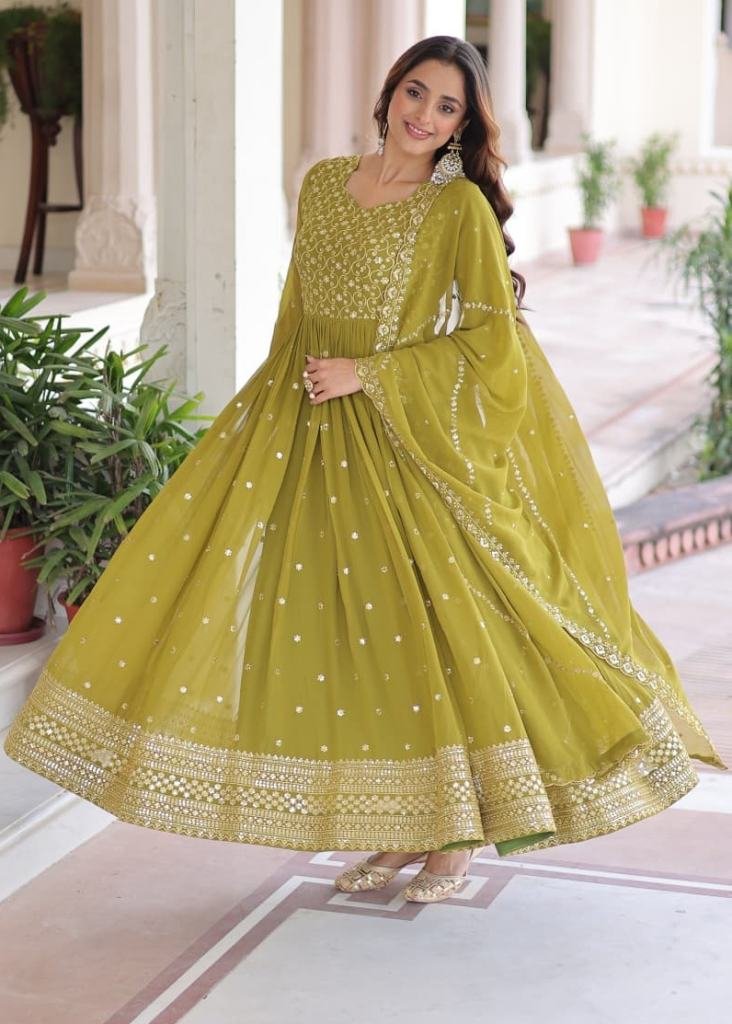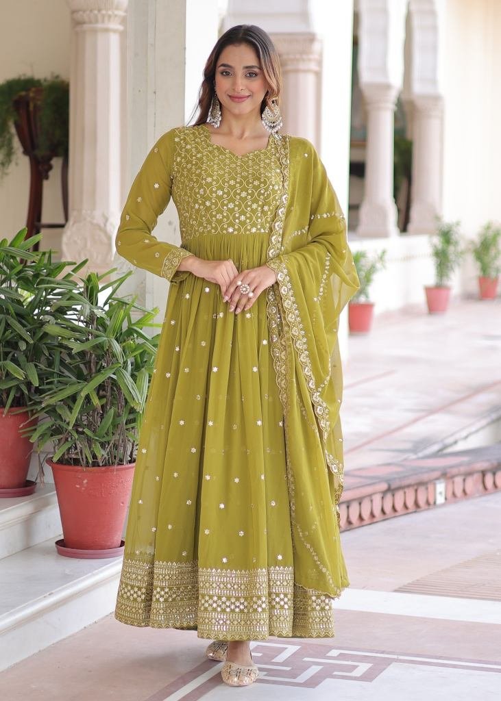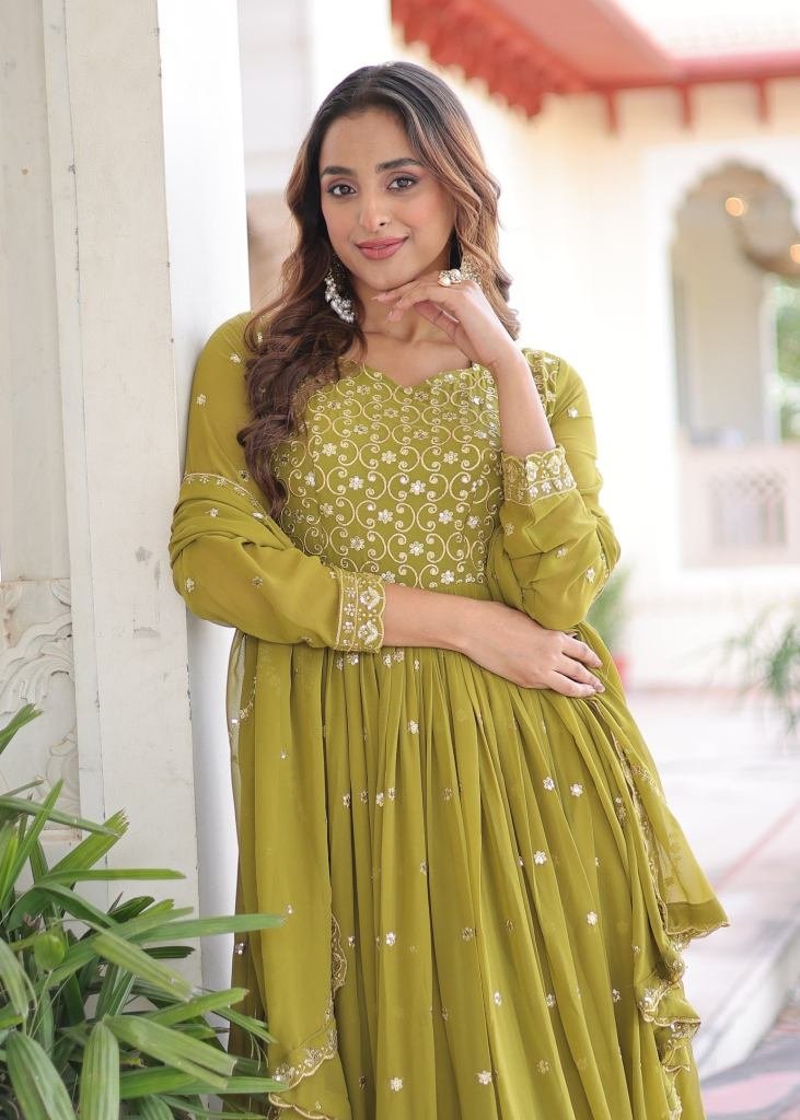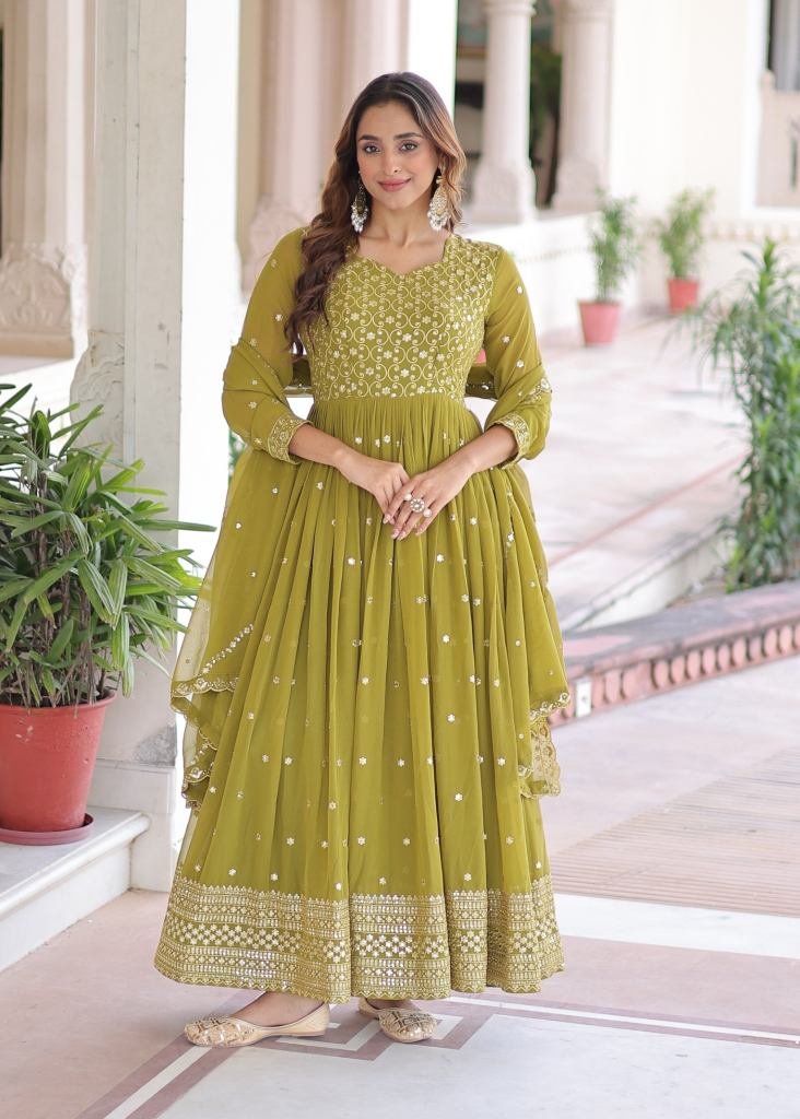| NAME : | Designer Anarkali Gown Faux Georgette With Embroidery Sequence And Zari Embroidered Work Mehndi Color LW DN 9282 |