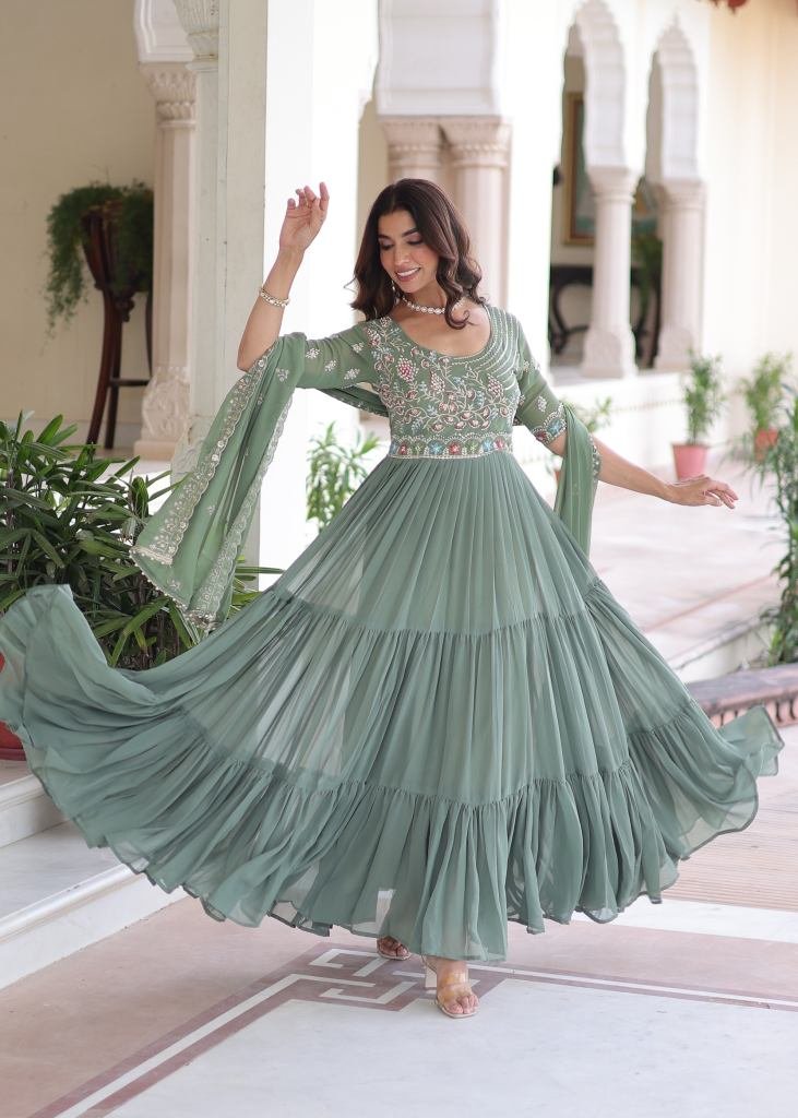 | NAME : | Designer Anarkali Gown Fox Georgette With Multi Thread Embroidery Sequence And Beads Work Pista Green Color DN 1213 |
