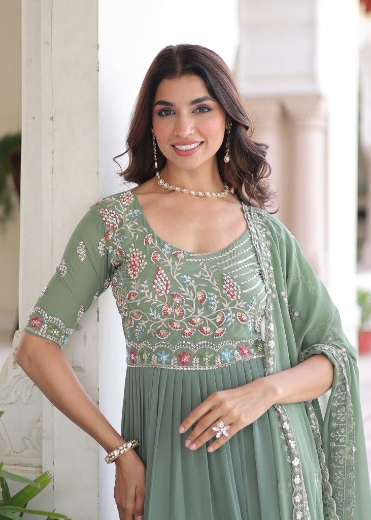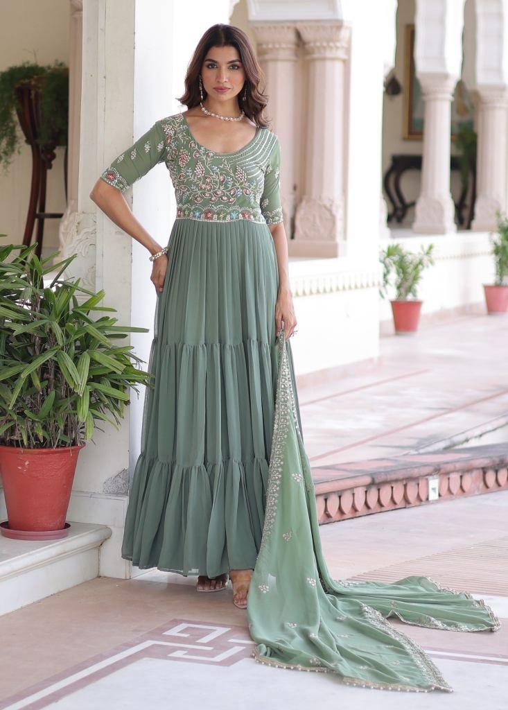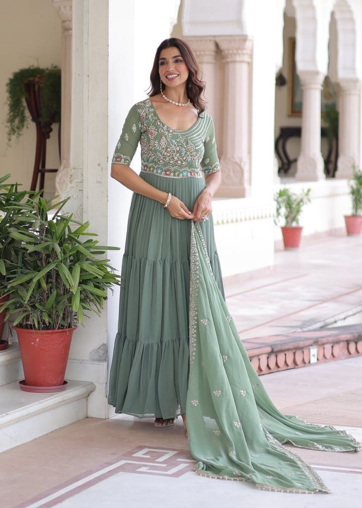 Designer Anarkali Gown Fox Georgette With Multi Thread Embroidery Sequence And Beads Work Pista Green Color DN 1213