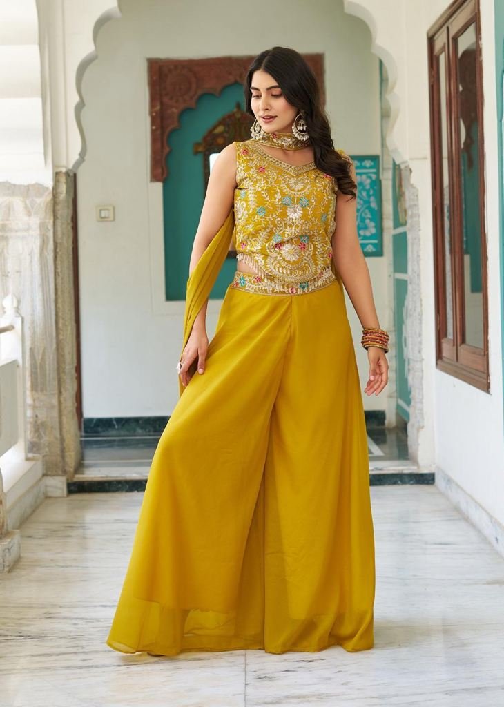 | NAME : | Designer Blouse Palazzo With Dupatta Star Georgette With Sequence And Embroidery Work Indo Western Yellow Color RM DN 107 |