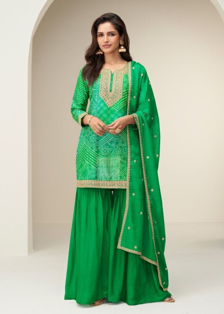 Designer Heavy Chinon Digital Print With Embroidery Coding Sequence Work Palazzo Suit Parrot Color DN 10413