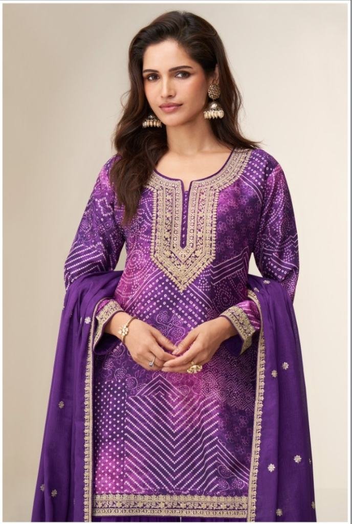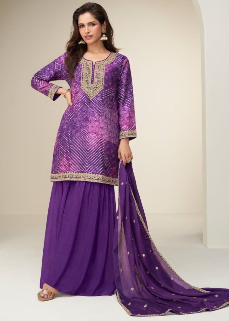 | NAME : | Designer Heavy Chinon Digital Print With Embroidery Coding Sequence Work Palazzo Suit Purple Color DN 10414 |