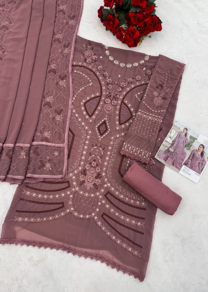 Designer Maaria A Pakistani Suit Heavy Faux Georgette With Embroidery Sequence Work With Moti And Neck Khatli Work Dusty Pink Color DN 1187