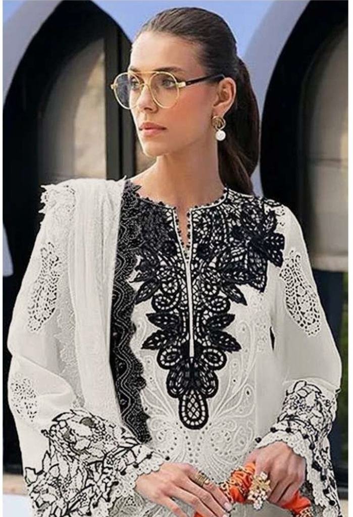 NAME : | Designer Pakistani Maaria A Heavy Faux Georgette With Embroidery Sequence Work With Boring And Neck Khatli Work White Color DN 1184 |