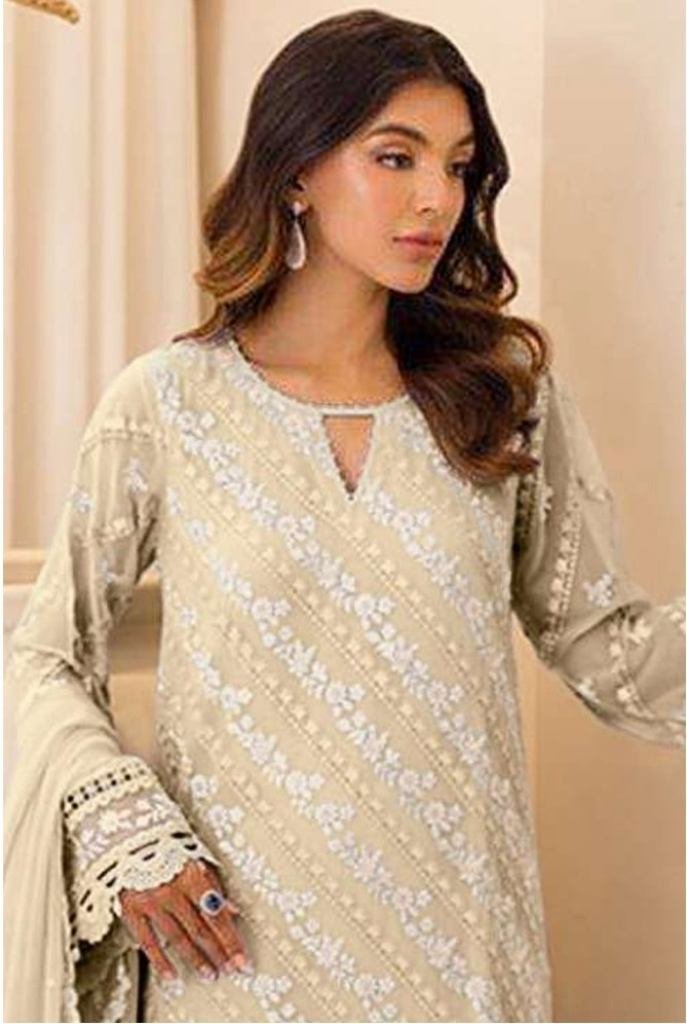 Designer Pakistani Maaria A Heavy Fox Georgette With Embroidery Sequence Work With Zarkan Pakistani Suit Off White Color DN 1180