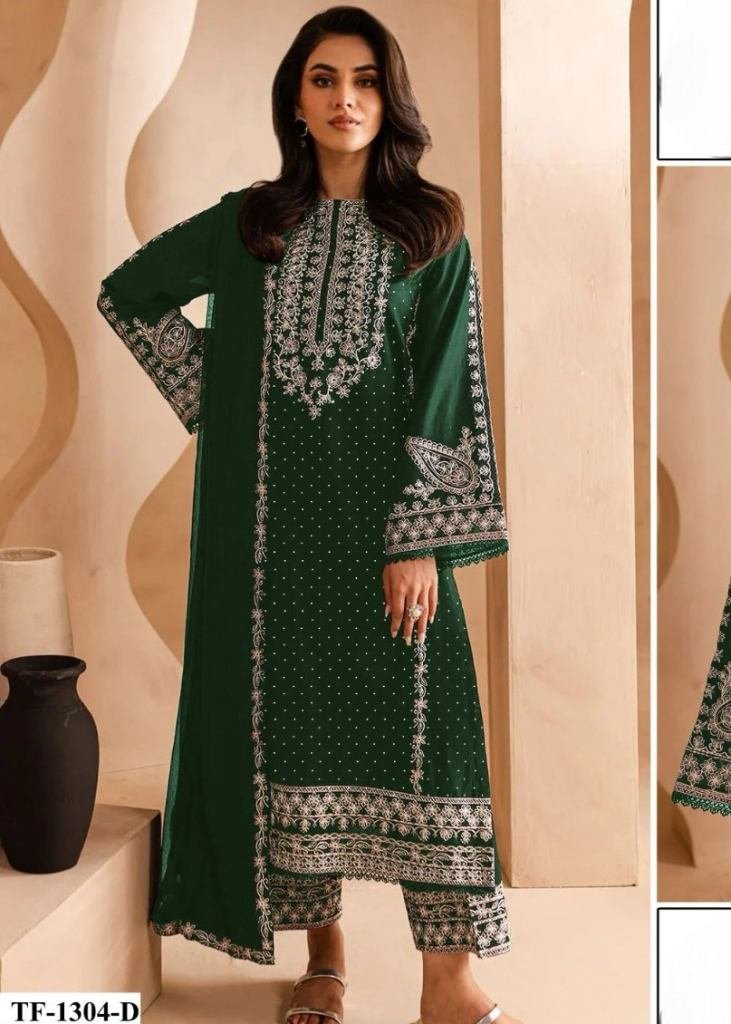 | NAME : | Designer Pakistani Suit Heavy Faux Georgette With Embroidered Two Tone Thread Work Dark Green Color DN 1304 |