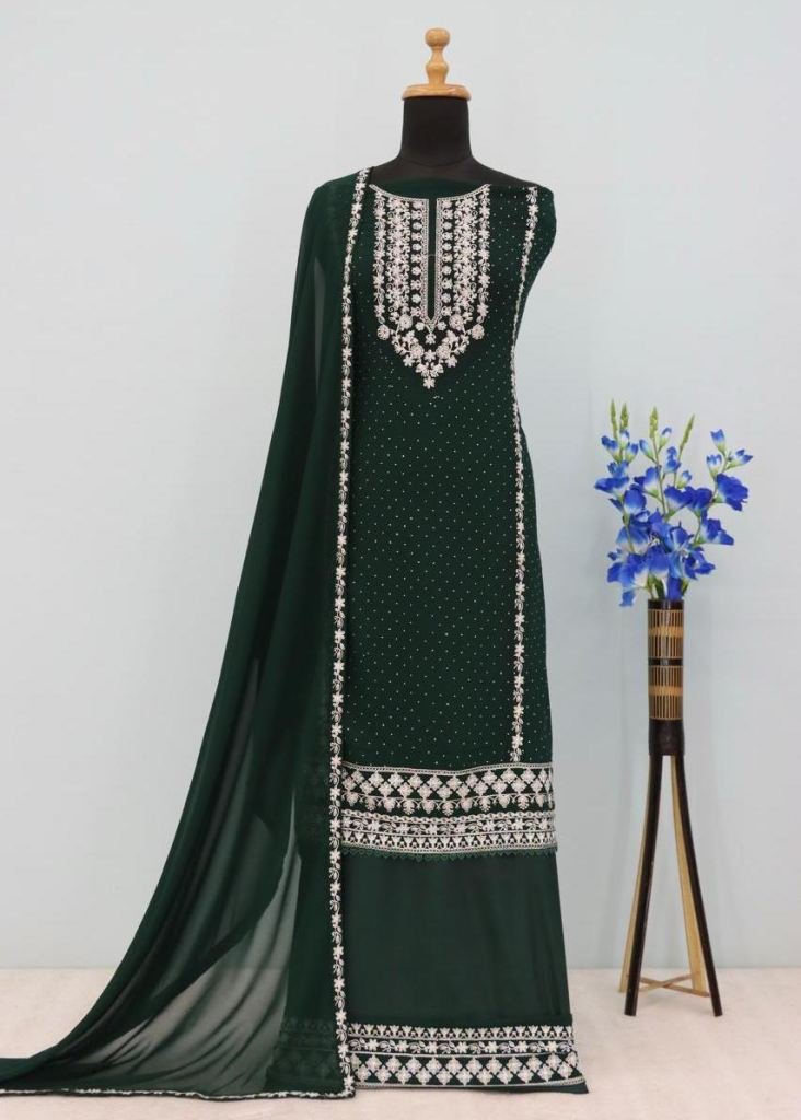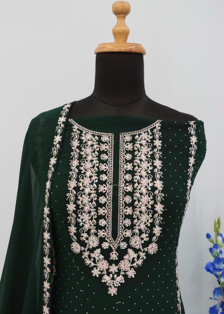 Designer Pakistani Suit Heavy Faux Georgette With Embroidered Two Tone Thread Work Dark Green Color DN 1304