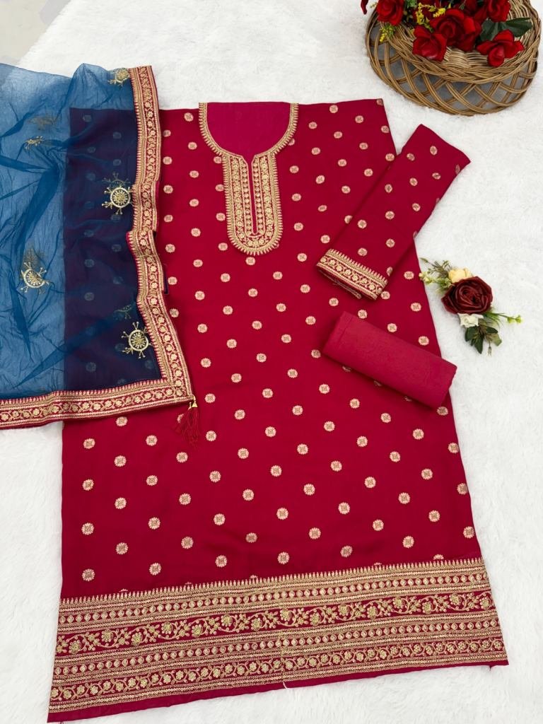 | NAME : | Designer Patiala Suits In Pure Viscose Jacquard With Sequence Embroidery Red DN 704 |