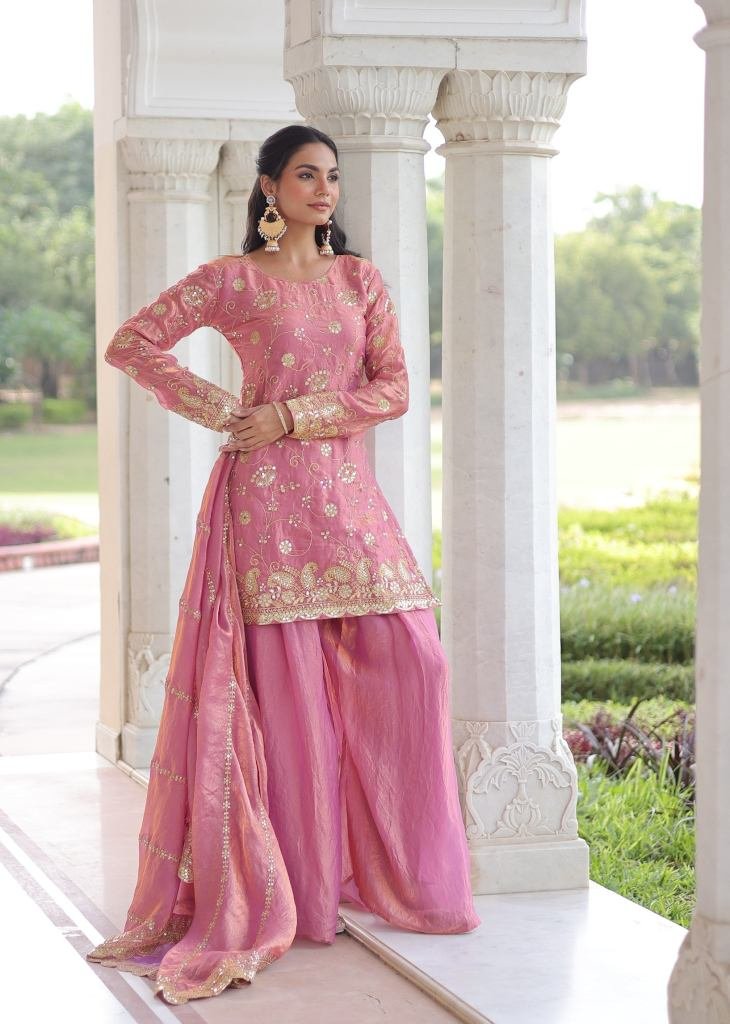 | NAME : | Designer Sharara Suit Fendy with Rich Sequences & Zari Embroidered Cut Work Light Pink Color DN 9300 |