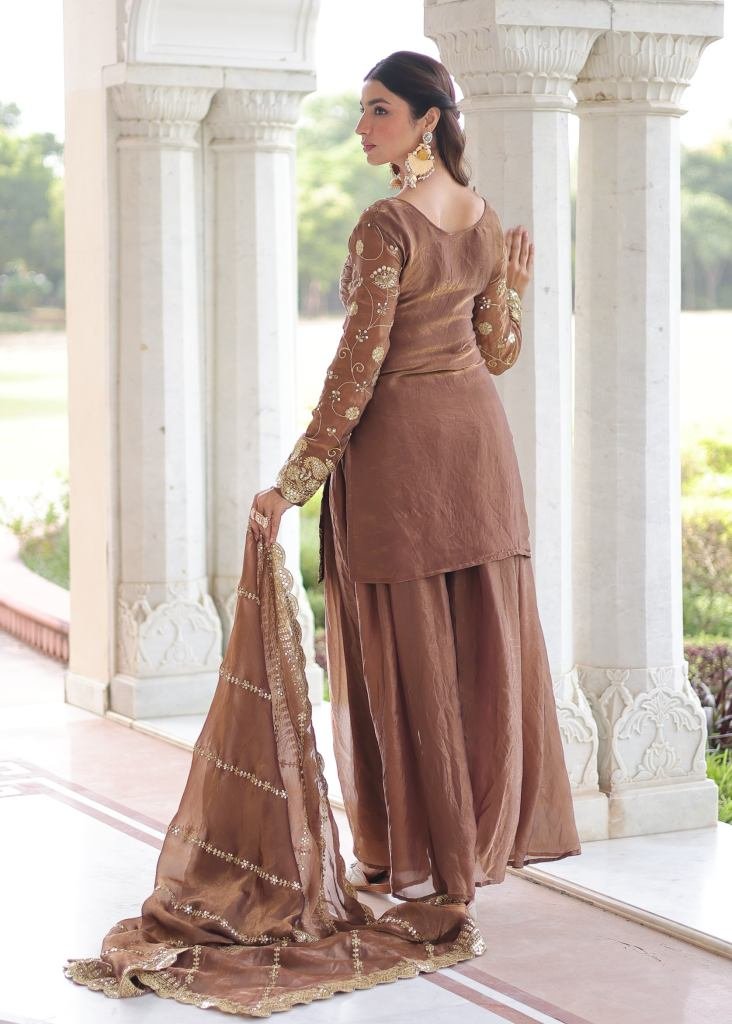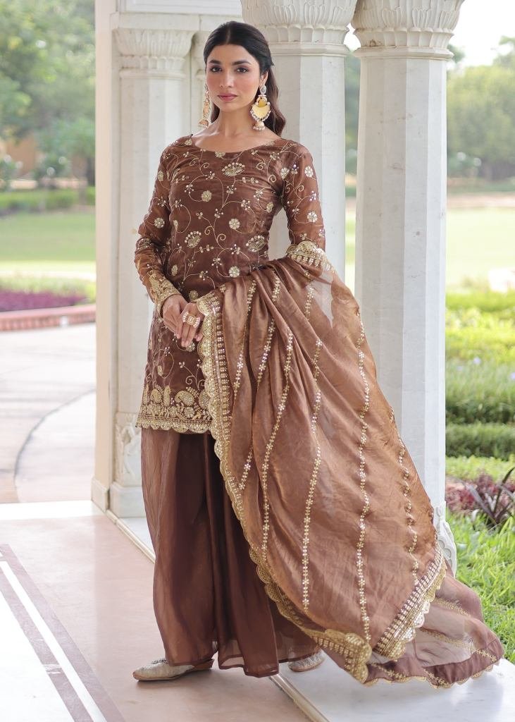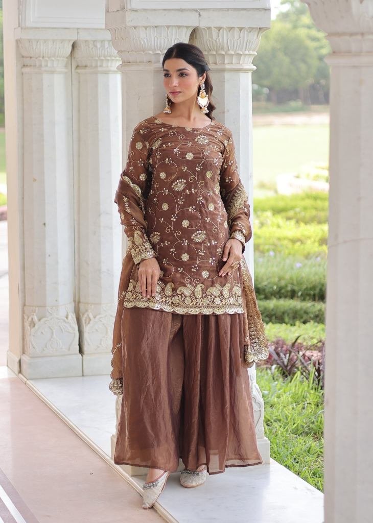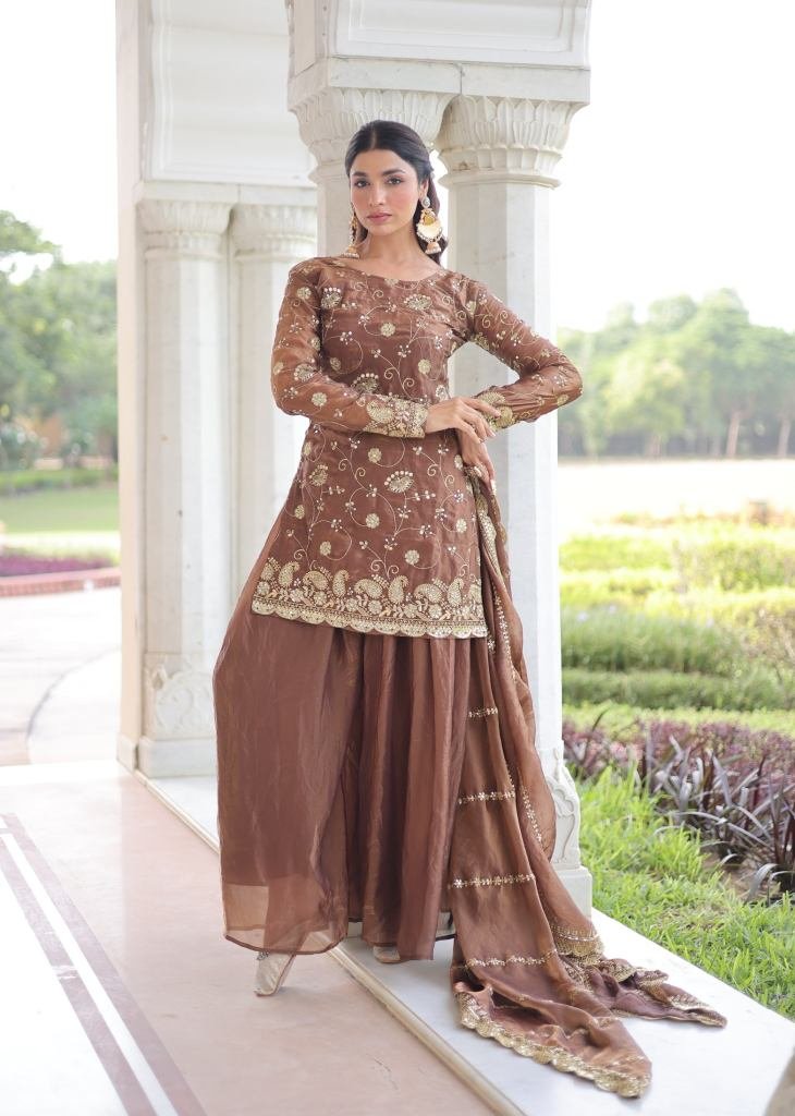 Designer Sharara Suit Fendy with Rich Sequences & Zari Embroidered Cut Work Coffee Color DN 9300