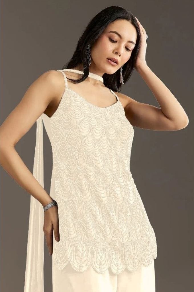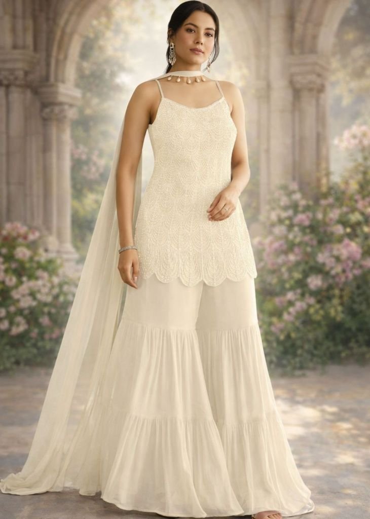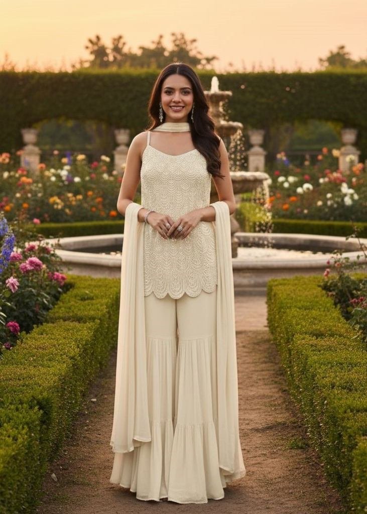 | NAME : | Designer Sharara Suit With Fine Embroidery Beads Work In Heavy Faux Georgette Off-White DN 1313 |