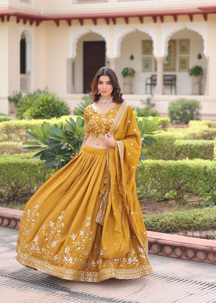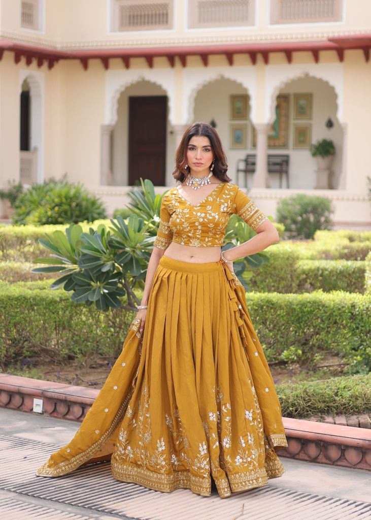 | NAME : | Designer Vichitra Silk Lehenga Choli With Heavy Sequence And Zari Embroidery Mustard Yellow Color DN 7156 |