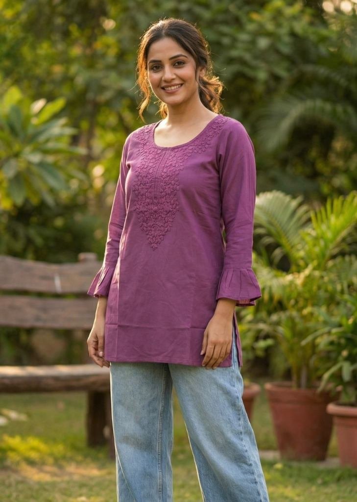 | NAME : | Dharmi Vol 2 Ladies Heavy Rayon Short Length Kurti With Chikan Work And Fancy Sleeves Western Tops Purple Color |