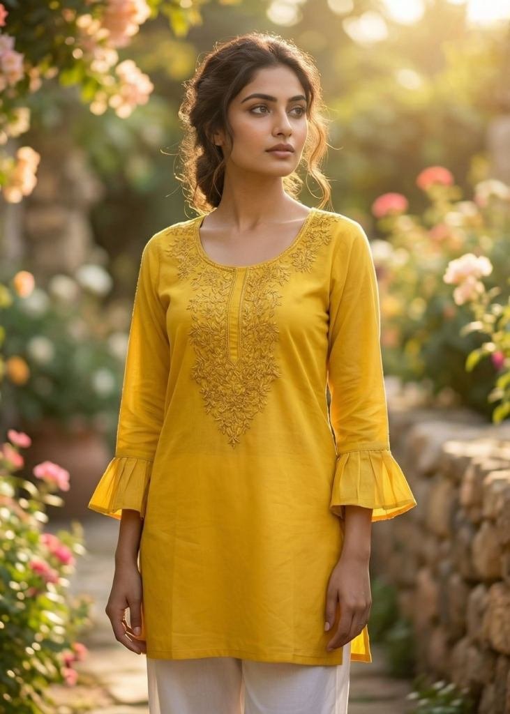 | NAME : | Dharmi Vol 2 Ladies Heavy Rayon Short Length Kurti With Chikan Work And Fancy Sleeves Western Tops Yellow Color |