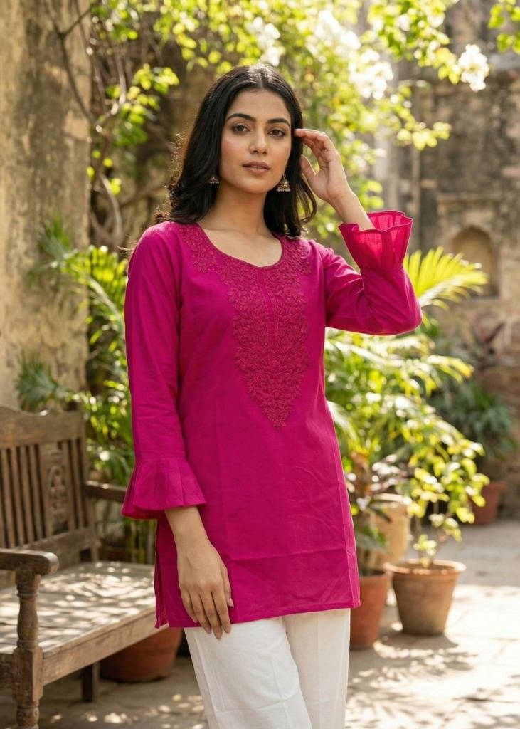 | NAME : | Dharmi Vol 2 Ladies Heavy Rayon Short Length Kurti With Chikan Work And Fancy Sleeves Western Tops Magenta Color |