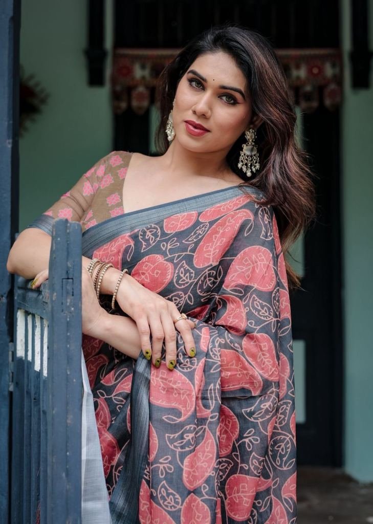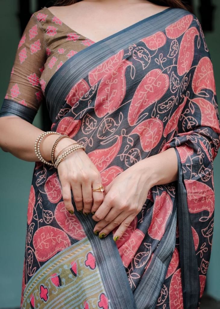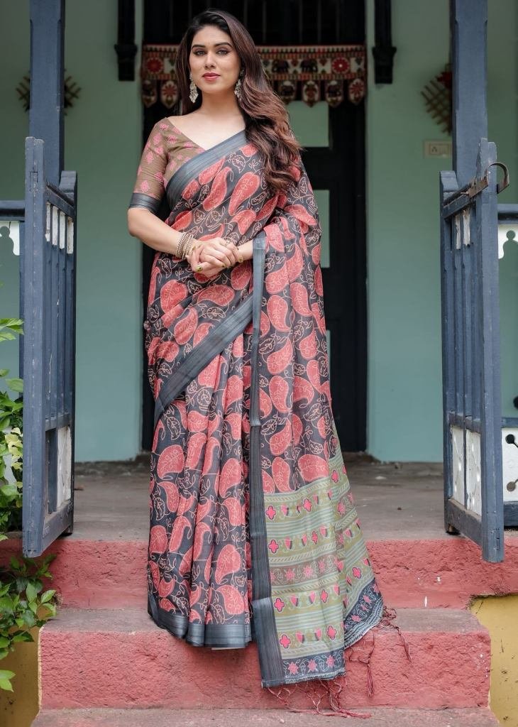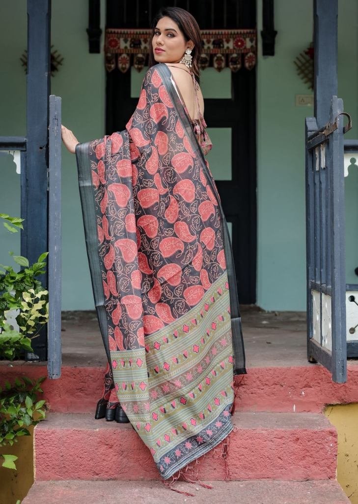 Earthy Olive And Charcoal Gray With Coral Leaf And Floral Motifs Pure Linen Saree with Tassels Dusty Pink Color DN 111