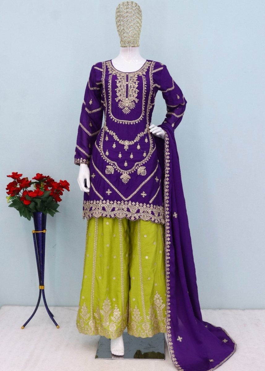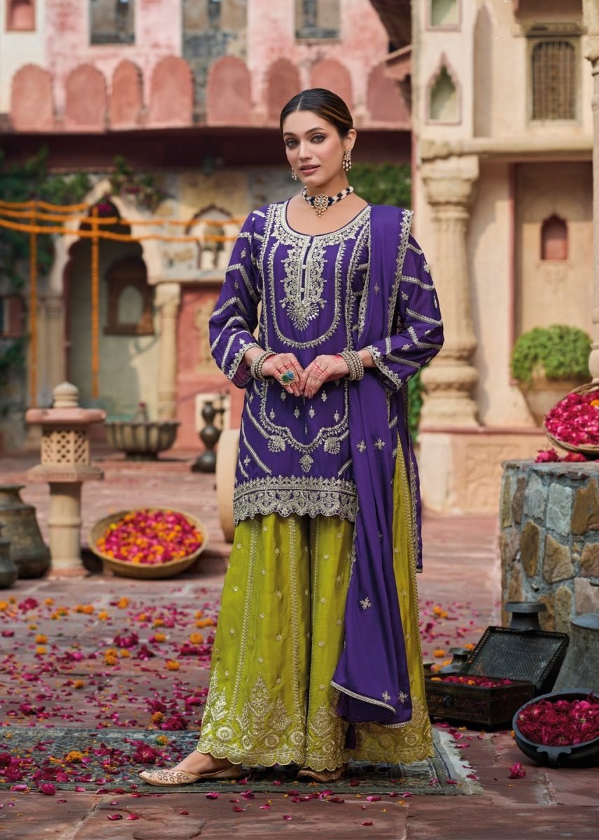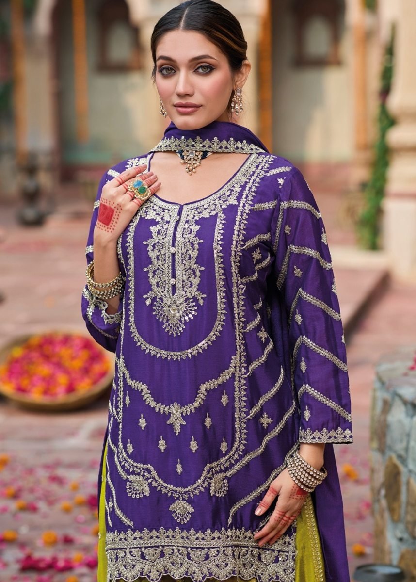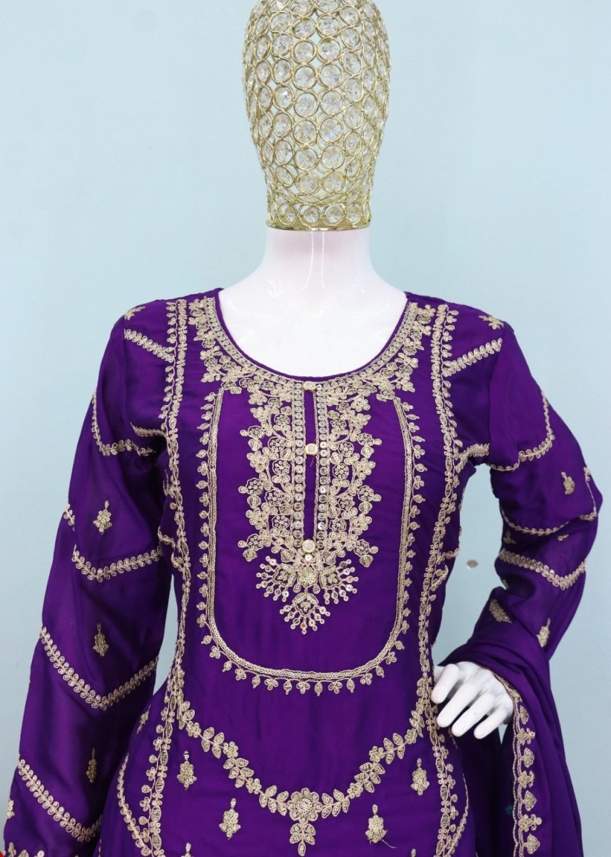 | NAME : | Eba Lifestyle Kanak DN 1798 Chinon Silk With Embroidery Codding And Sequence Work Palazzo Suit Purple Color |