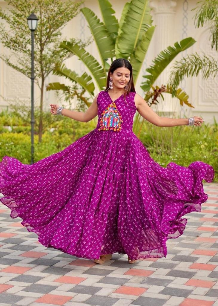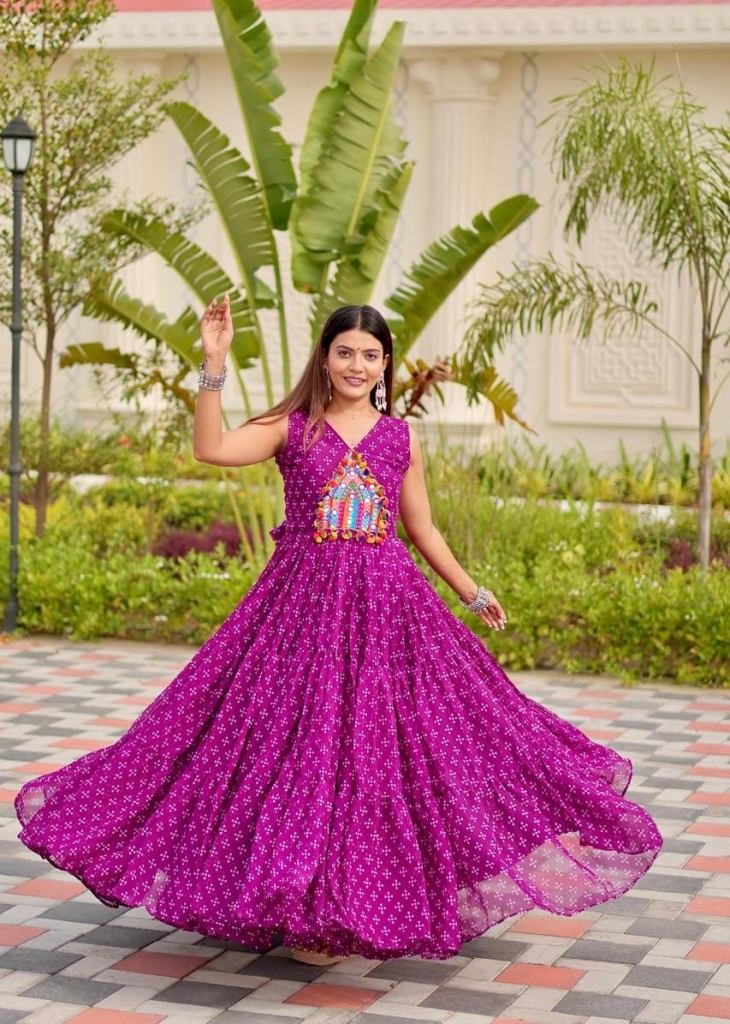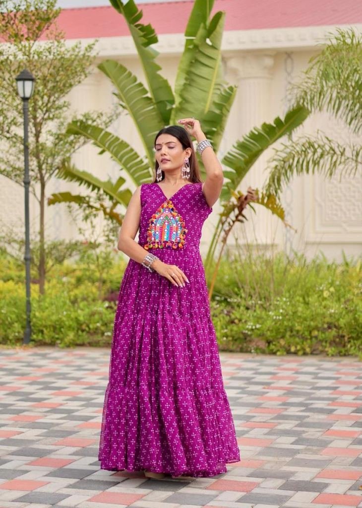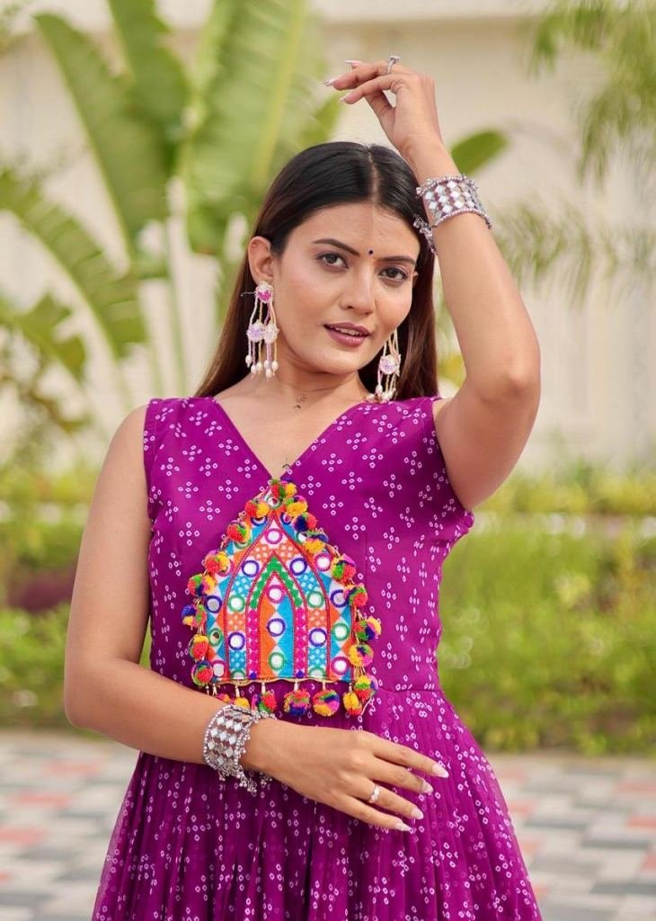Exclusive Navratri Faux Georgette Embroidery Thread Work And Real Mirror With Repayment Lace Gown Purple Color DM 128