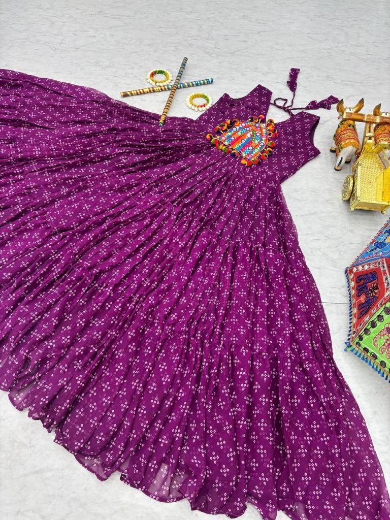 NAME : | Exclusive Navratri Faux Georgette Embroidery Thread Work And Real Mirror With Repayment Lace Gown Purple Color |