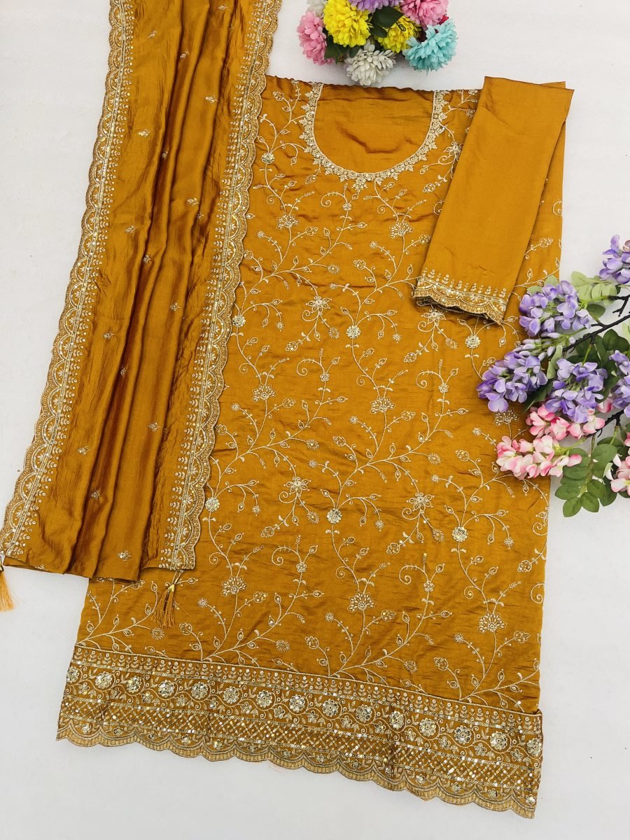 | NAME : | Fancy Designer DN 3109 Vichitra Silk With Heavy Embroidery Work Pant Style Designer Suit Mustard Yellow Color |