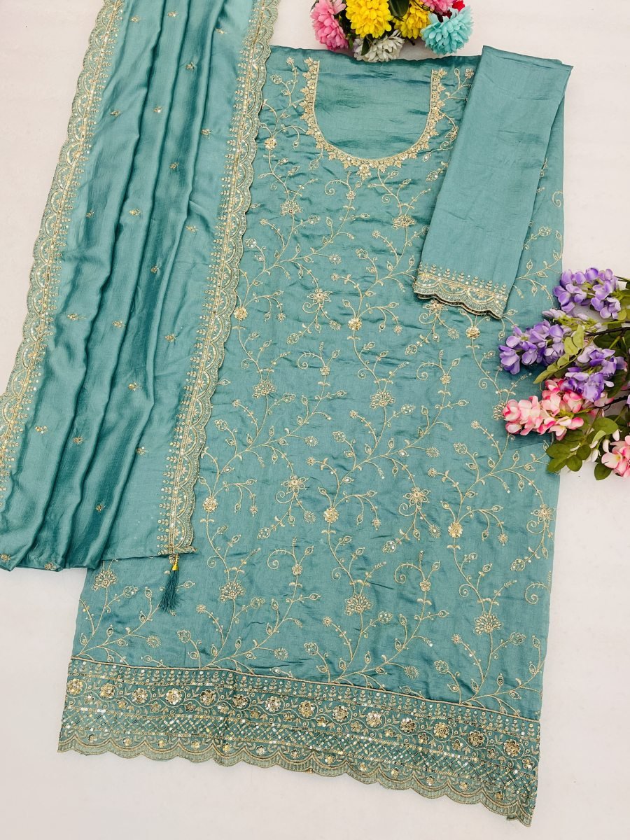 | NAME : | Fancy Designer DN 3109 Vichitra Silk With Heavy Embroidery Work Pant Style Designer Suit Teal Color |