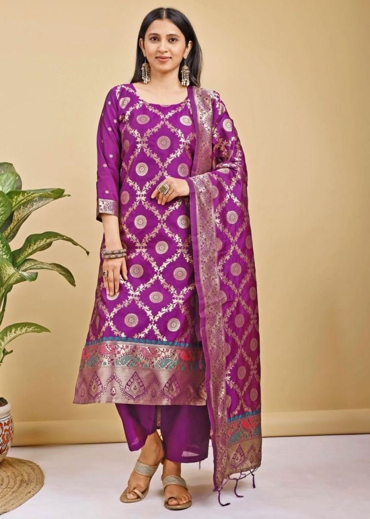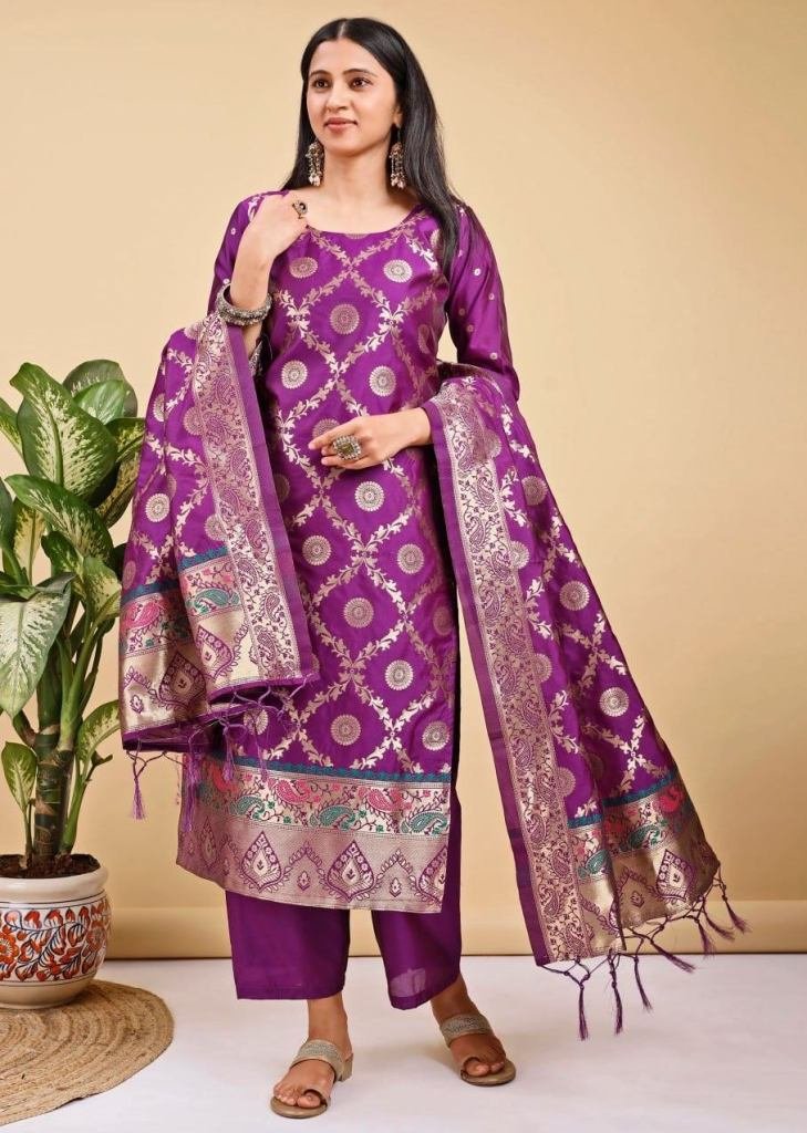 | NAME : | Festive Banarasi Silk Kurta Pant Dupatta Set With Woven Buti And Fully Lined Kurta Purple Color |