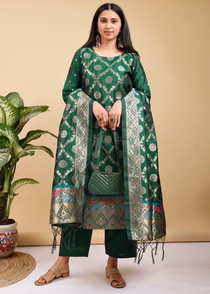 Festive Banarasi Silk Kurta Pant Dupatta Set With Woven Buti And Fully Lined Kurta Green Color
