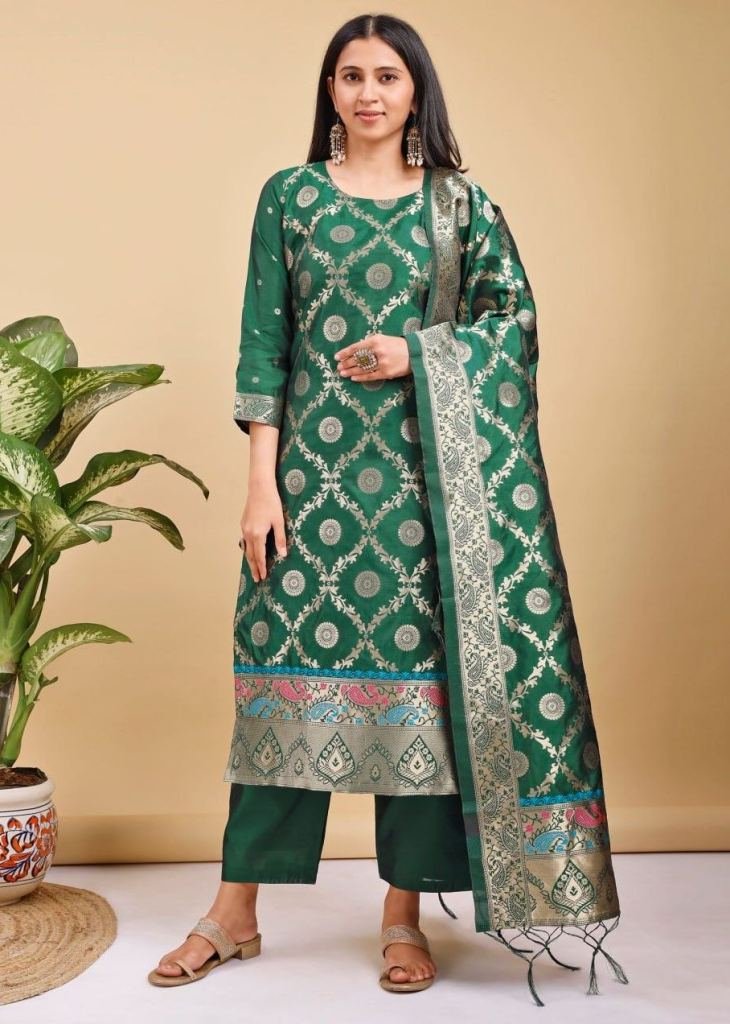 | NAME : | Festive Banarasi Silk Kurta Pant Dupatta Set With Woven Buti And Fully Lined Kurta Green Color |