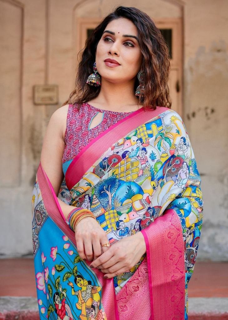 Color: Multi color Traditional Artwork on a Sky Blue Base with a Pink Zari Border