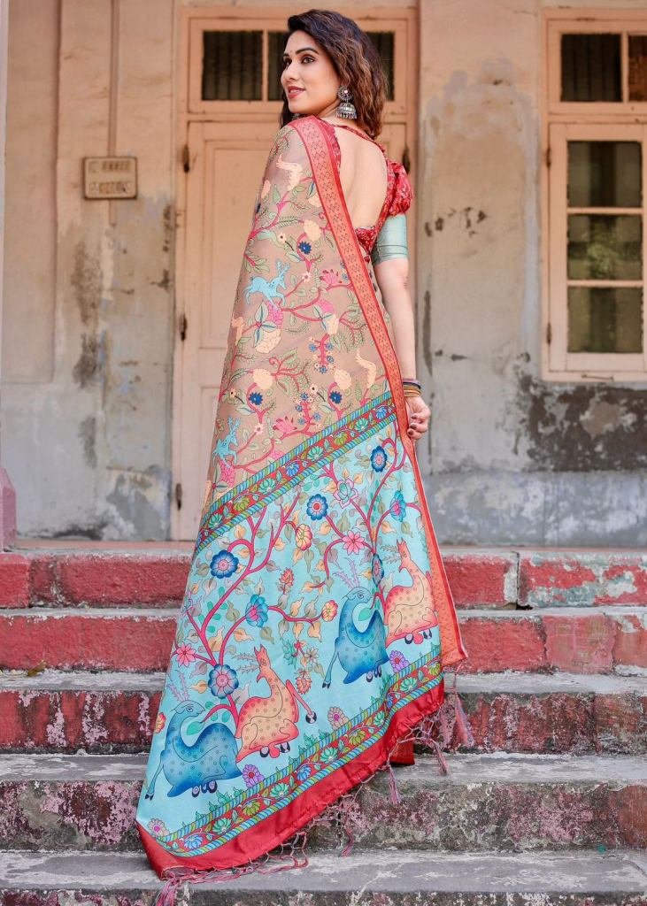Color: Beige & Aqua Base with a classic Red Zari Border featuring vibrant floral artistry