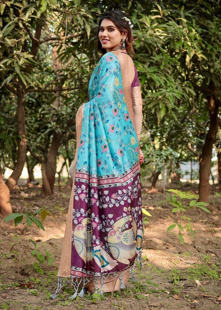 | NAME : | Graceful Hand-Painted Florals And Majestic Peacocks On Pure Tussar Silk Aqua Blue Color DN 1058 |