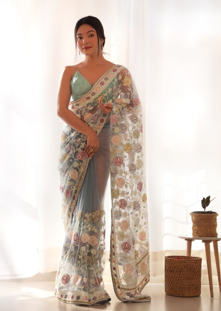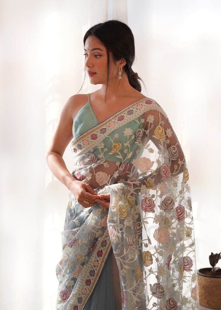Gulabo Most Beautiful Latest Saree Collection Heavy Butterfly Net With Real Modelling Grey Color