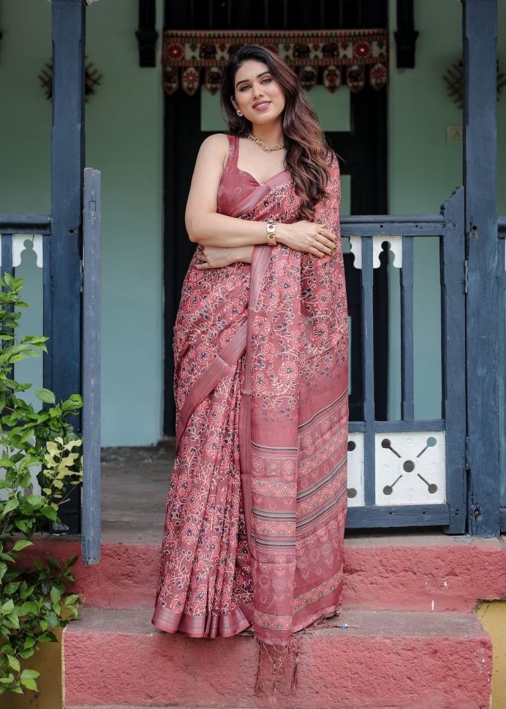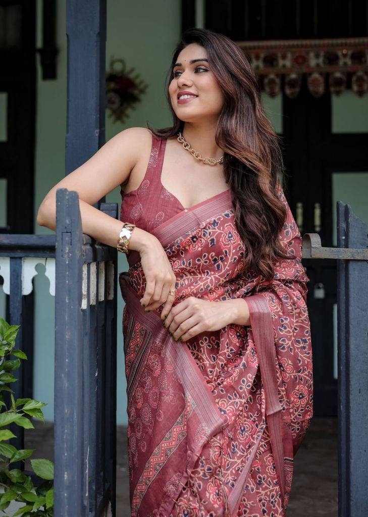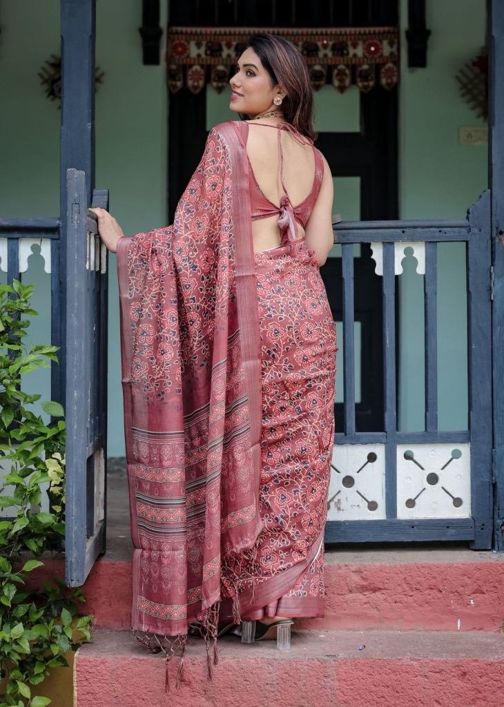Heritage Elegance Sophisticated Blend Of Rich Tradition And Hand Block Prints Linen Saree Rust Red DN 108