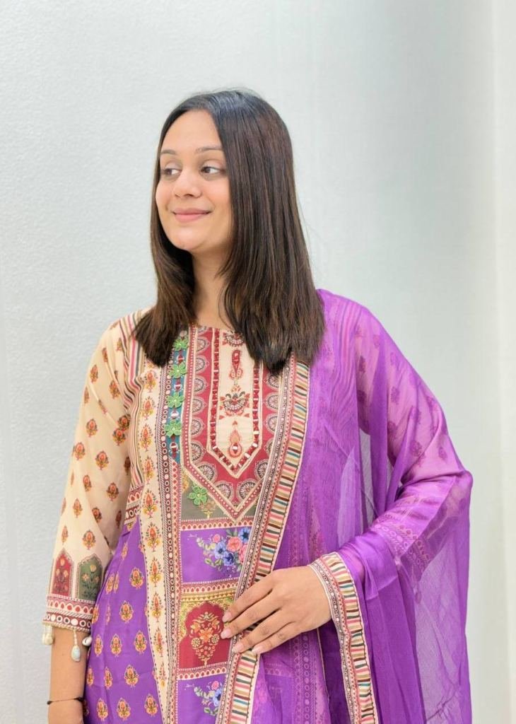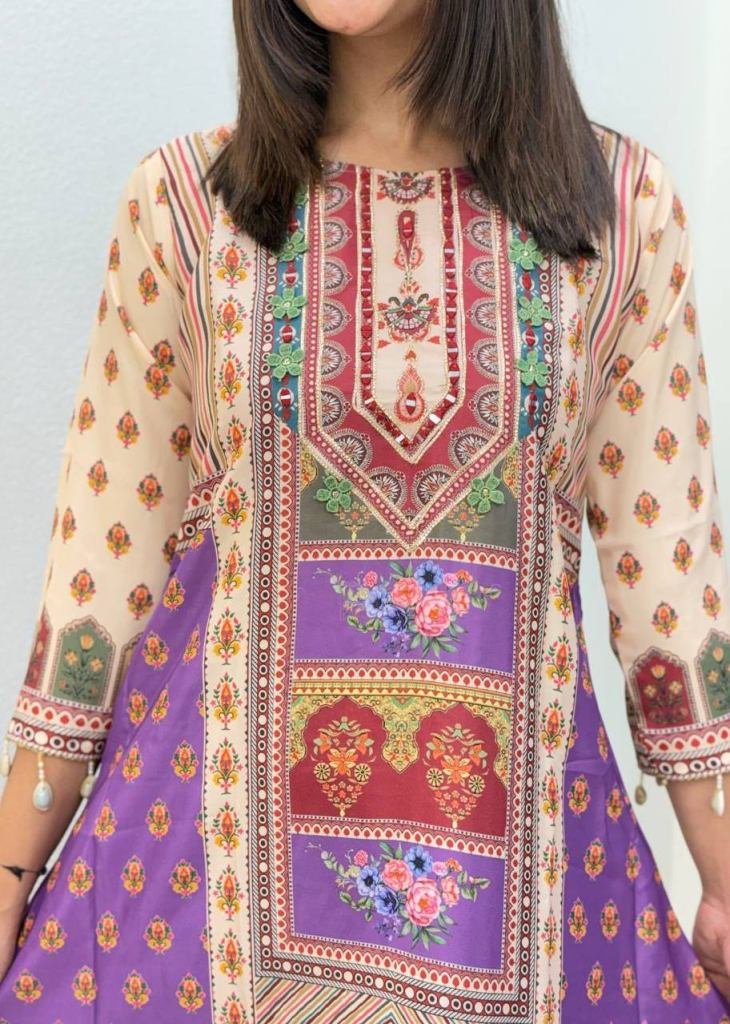 | NAME : | Jasood Kodi Anarkali Gown 3 Piece Set Crafted In Pure Chinon With Mirror Hand Work Purple Color |