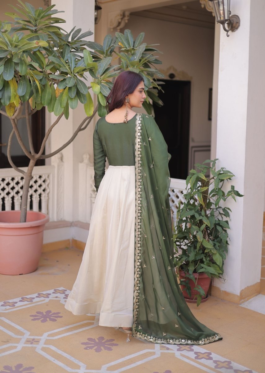 | NAME : | KA DN 1231 Premium Designer Gown Set With Rich Sequence Embroidery And Kali Flair In Green & White Color |