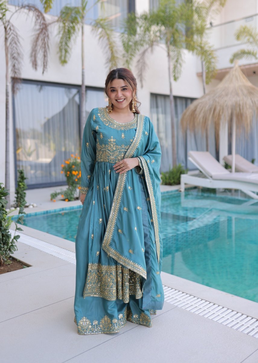| NAME : | KA DN 1233 Premium Super Silk Kurta Sharara Set With Elegant Sequence Work In Sky Blue color |